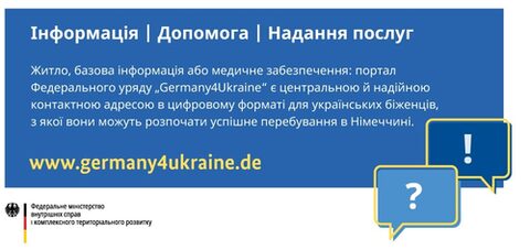 Über das Portal und die neue App „Germany4Ukraine“ finden Geflüchtete aus der Ukraine gesicherte und aktuelle Information zu Einreise, Registrierung und Aufenthalt. Auf Ukrainisch, Russisch, Englisch und Deutsch sind die weiteren Wege und Optionen für die verschiedenen Phasen des Aufenthalts in Deutschland übersichtlich aufbereitet. Außerdem stehen Informationen zu Weiterreise, Unterbringung, Gesundheit und sozialer Unterstützung bereit.