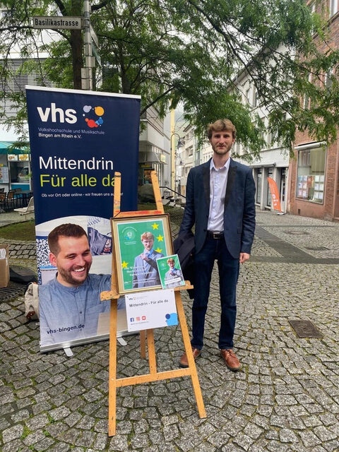 Wer am letzten Samstag in der Binger Innenstadt unterwegs war, hat sich vielleicht über den nicht bekannten Wahlkandidaten gewundert: Am Stand von Jacques Jambon gab es offiziell aussehende Wahlwerbung. Wer aber den QR-Code scannte, landete auf der Seite der vhs Bingen. Dort heißt es dann: „Wir freuen uns, Ihnen Jacques Jambon vorstellen zu können. Er kandidiert für das EU-Parlament als Spitzenkandidat der Deutsch-Europäischen-Weinrhein-Partei. Als Partei des gesunden Menschenverstands stimmt er in seinen Videos auf seine Wahlthemen ein: Im ersten Video nimmt er sich die Zeitumstellung und im zweiten die Bewerbung Bingens zur Kulturhauptstadt Europas vor.“