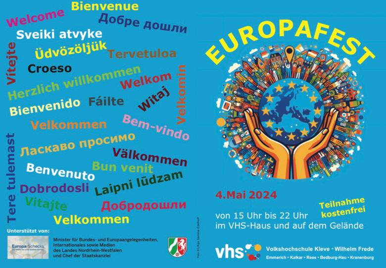 Vor den Europawahlen steht in der öffentlichen Wahrnehmung häufig die politische Dimension der europäischen Union im Fokus. Doch Europa ist mehr als sein Parlament. Europa ist die Summe seiner Menschen! Beim Europafest der vhs Kleve hieß es deshalb Anfang Mai mit einem bunten Programm „Bienvenue, Velkommen und Willkommen“.
