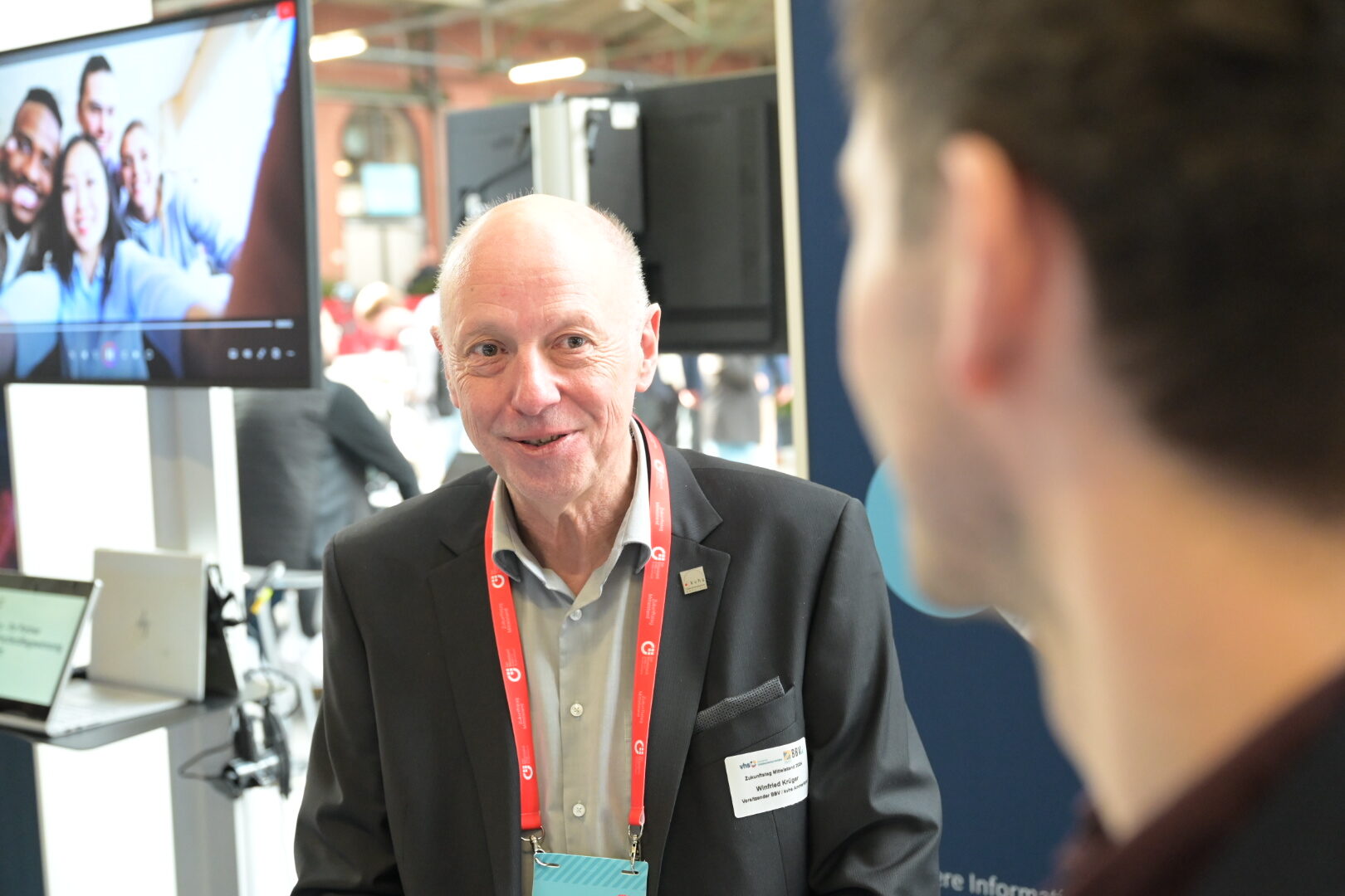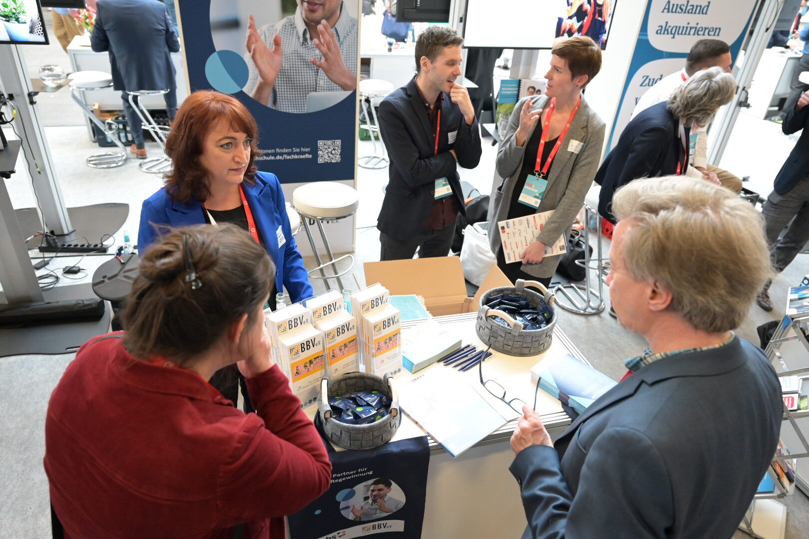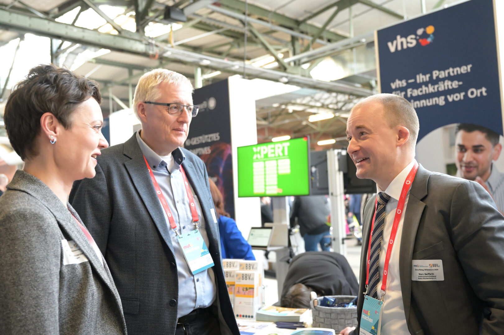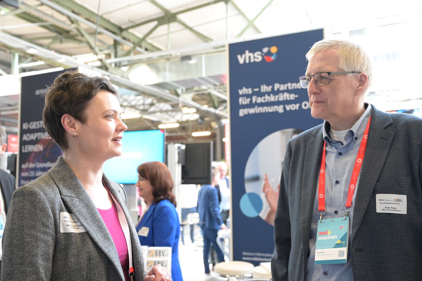 Auch Winfried Krüger, Vorsitzender des BBV, zeigte sich höchstzufrieden mit der Teilnahme: „Berufliche Bildung ist an zahlreichen Volkshochschulen nicht nur in der geförderten Arbeitsmarktintegration oder als Angebot für Einzelkunden etabliert, sondern auch in Form passgenauer, qualitativ hochwertiger Zuschnitte für KMU. Beim Zukunftstag Mittelstand ist es uns am Ende sogar deutlich besser als erwartet gelungen, an prominenter Stelle dieses Chancenpotenzial deutlich zu platzieren. Unser Auftritt kann als voller Erfolg bewertet werden und damit als Signal, diesem Arbeitsfeld in Zeiten eines gravierenden Fachkräftemangels künftig in der täglichen vhs-Arbeit, aber auch in der verbandlichen Rahmung einen noch wesentlicheren Stellenwert beizumessen.“