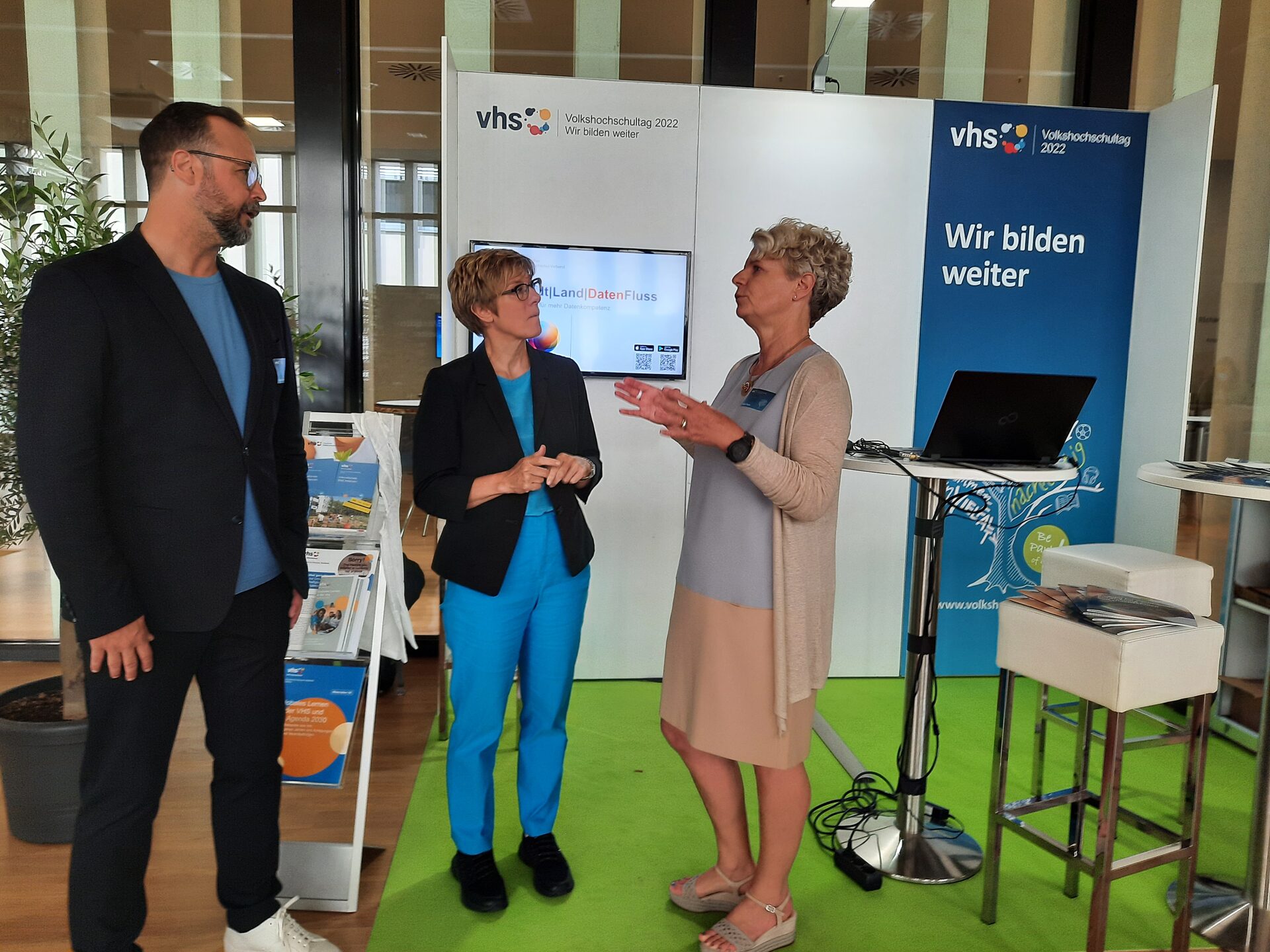 „Wir haben das in Rekordzeit geschafft!“ Auf dem gerade zu Ende gegangenen 15. Volkshochschultag in Leipzig zeigte sich Annegret Kramp-Karrenbauer, Präsidentin des Deutschen Volkshochschul-Verbands (DVV), begeistert von der App „Stadt|Land|DatenFluss“ des DVV. Die damalige Verteidigungsministerin hatte die ersten Überlegungen zum Thema im Bundeskanzleramt verfolgt, den Entstehungsprozess mitinitiiert und die öffentliche Freischaltung der App im Februar 2021 eng begleitet: „Ich war selbst dabei, als wir im Rahmen der Digitalen Strategie mit der damaligen Bundeskanzlerin Angela Merkel die Frage diskutiert haben ´Wie machen wir ein Angebot, das spielerisch und niedrigschwellig viele Menschen erreicht?´. Frau von Westerholt kann sich sicher noch gut daran erinnern, als wir dann gesagt haben ´Wir Volkshochschulen machen diese App zur digitalen Bildung´. – Da gab es große Augen von vielen Expertinnen und Experten.“