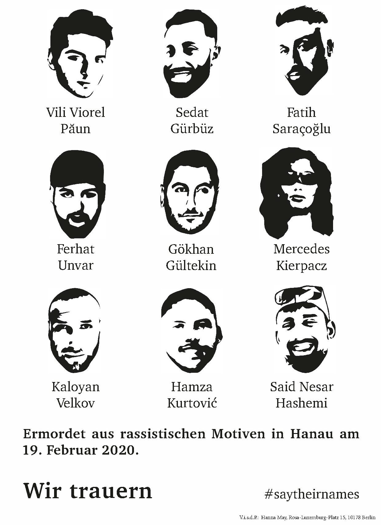 Heute vor zwei Jahren verloren Ferhat Unvar, Hamza Kurtović, Said Nesar Hashemi, Vili Viorel Păun, Mercedes Kierpacz, Kaloyan Velkov, Fatih Saraçoğlu, Sedat Gürbüz und Gökhan Gültekin bei einem rassistischen Mordanschlag in Hanau ihr Leben.