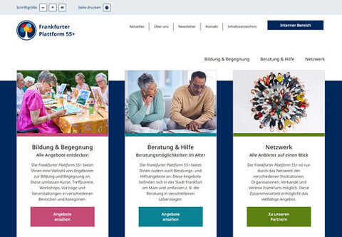 Das Webportal frankfurter-plattform-55plus.de bündelt eine Vielzahl von Bildungs- und Beratungsangeboten für ältere Menschen und bietet die Möglichkeit, leicht miteinander in Kontakt zu treten. Die Website ist dabei möglichst zielgruppengerecht gestaltet: Die Menüführung ist einfach und verständlich, große Schrift und ausgeprägten Kontraste erleichtern die Lesbarkeit. Die Plattform ist ein Projekt, das in Zusammenarbeit von Bildungsdezernat, Volkshochschule, dem Seniorenbeirat und einem vielfältigen Netzwerk aus Frankfurter Organisationen und Institutionen aus der Seniorenbildung/-beratung umgesetzt wurde und weiterentwickelt wird. Das Netzwerk ist offen für öffentliche Einrichtungen, Vereine, Verbände als auch für private Unternehmen und Gesellschaften. Die Teilnahme ist für alle Beteiligte kostenfrei.
