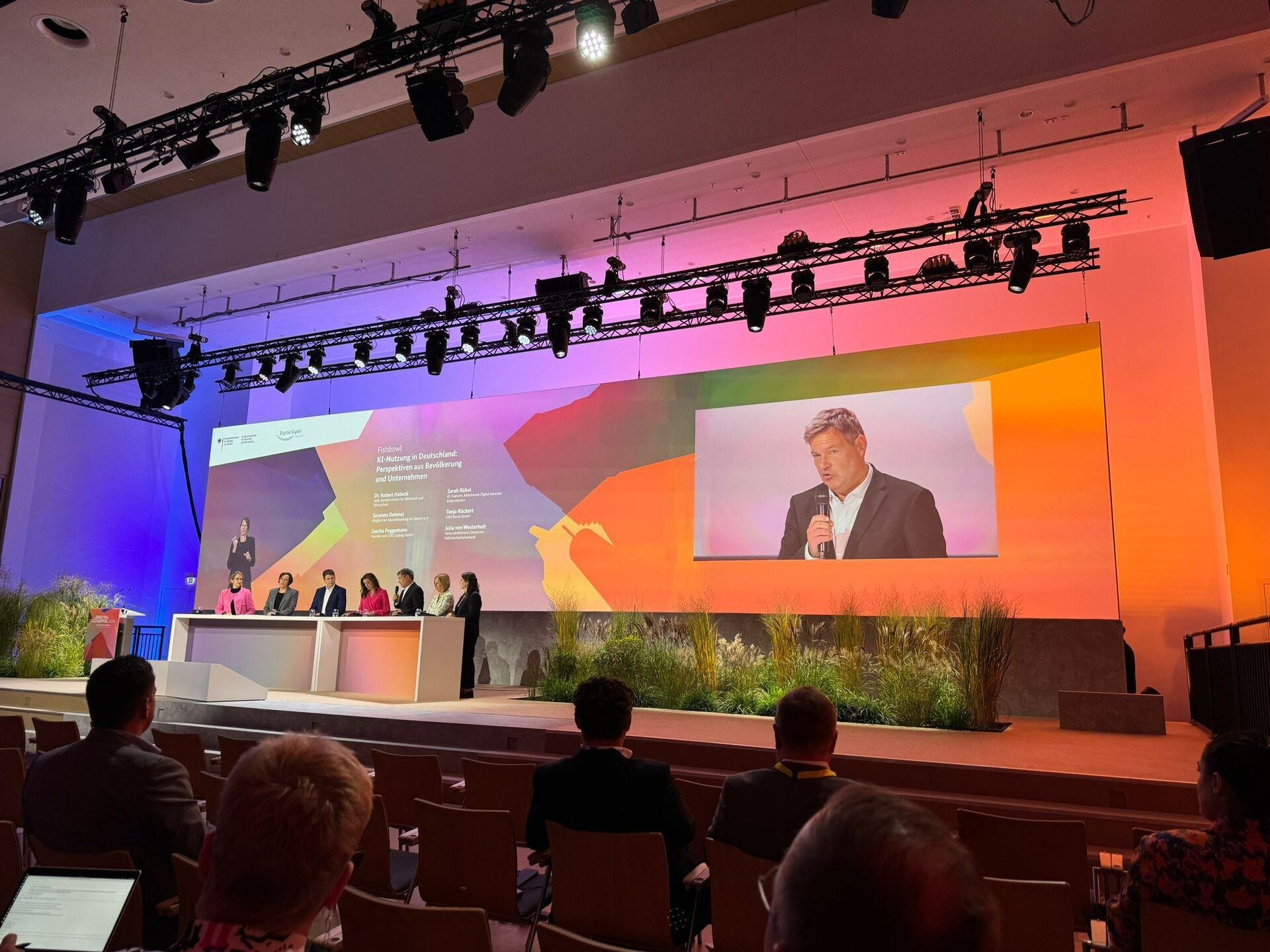 Wie verbreitet nutzen Unternehmen in Deutschland KI? Welche Herausforderungen gibt es dabei? Und wie blicken die Menschen im Land auf KI-Anwendungen? Diese und weitere Fragen beantwortet eine repräsentative Studie des Bitkom zur KI-Nutzung in Deutschland, deren Ergebnisse von DVV-Direktorin Julia von Westerholt, Dr. Robert Habeck (MdB, Bundesminister für Wirtschaft und Klimaschutz), Susanne Dehmel (Mitglied der Geschäftsleitung des Bitkom e. V.), Sascha Poggemann (Founder und COO, Cognigy GmbH), Sarah Rübel (KI-Trainerin, Mittelstand-Digital Zentrum Kaiserslautern) und Tanja Rückert (CDO Bosch GmbH) im Rahmen einer interaktiven Fishbowl am 21. Oktober 2024 diskutiert wurden.