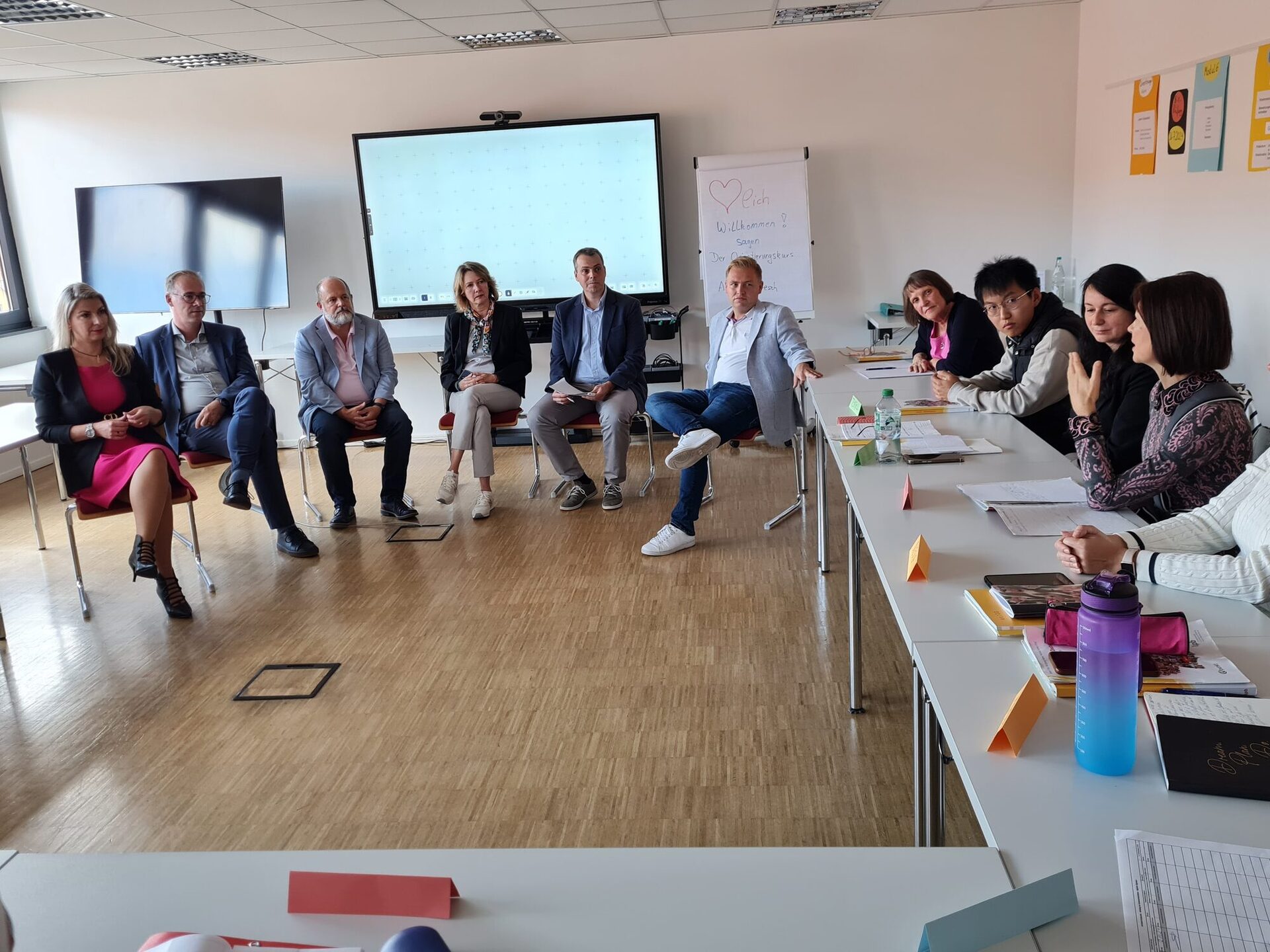 Stephan Seiter zeigte sich nach Gesprächen mit den 18 Teilnehmer*innen eines Integrationskurses beeindruckt: Dass Menschen nach einem Trauma, etwa der Zerstörung ihrer Heimat oder persönlicher Verfolgung, mittellos und verzweifelt in einem fremden Land neu beginnen, sei eine riesige und anerkennenswerte Leistung. Stefanie Köhler ergänzte, dass hier auch für den Arbeitsmarkt großes Potenzial liege: Unter den Teilnehmenden seien etliche, die in Berufen mit Fachkräftemangel wie Pflege und Kinderbetreuung ausgebildet seien. Für den Einsatz fehle nun nur noch die im Integrationskurs zu erwerbende Sprachkenntnis. Das sah Stefan Seiter ähnlich, wollte dabei aber eines festhalten: „Bildung ist mehr als reine Employability. Bildung ist die Voraussetzung für das Funktionieren der Gesellschaft.“