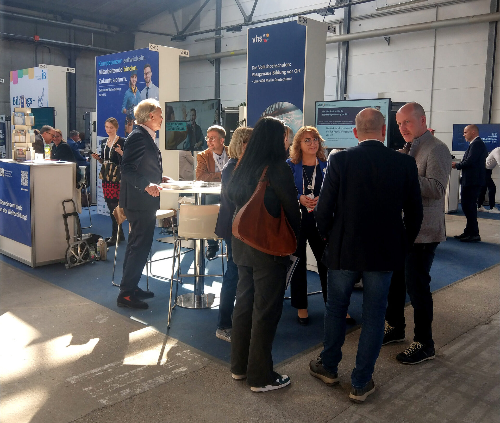Um die große Expertise der Volkshochschulen im Bereich der beruflichen Bildung sichtbar zu machen, waren der Deutsche Volkshochschul-Verband (DVV) und der Verein zur Förderung der beruflichen Bildung an Volkshochschulen (BBV) erneut mit einem Stand vor Ort. Als Teil der „Bildungsmeile“ präsentierten sie gemeinsam mit vhs-Vertreter*innen das vielseitige Leistungsspektrum für Unternehmer*innen: von praxisnahen Fort- und Weiterbildungen, die genau auf die Bedürfnisse von Betrieben zugeschnitten sind, über anerkannte Zertifizierungen und branchenspezifische Qualifizierung bis hin zur Sicherung und Gewinnung von Fachkräften.