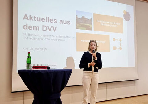 Die Teilnehmenden erlebten ein abwechslungsreiches Tagungsprogramm mit gemeinsamen Workshops, viel Raum für Austausch und Vernetzung und spannenden Beiträgen. DVV-Direktorin Julia von Westerholt berichtete von der aktuellen Arbeit des Bundesverbandes sowie dem gegenwärtigen Stand des Verbandsentwicklungsprozesses. Silja Klepp, Professorin für Humangeographie an der Universität Kiel und Inhaberin des UNESCO Lehrstuhls für Integrierte Meereswissenschaft, sprach über ihren Forschungsschwerpunkt sozial-ökologische Transformation. Damit verband sie Fragen von Klimagerechtigkeit und der Gestaltung von Klimapolitiken ebenso wie Überlegungen dazu, wie wir künftig leben wollen.