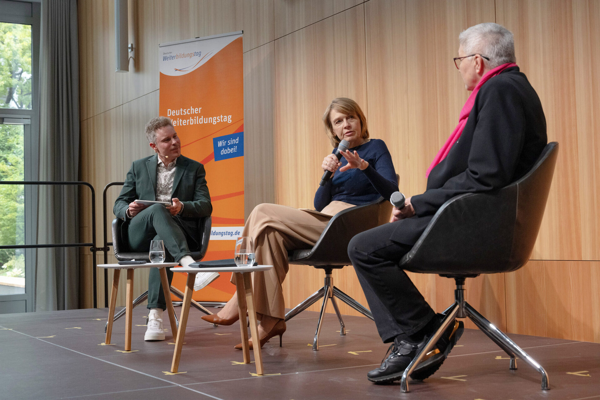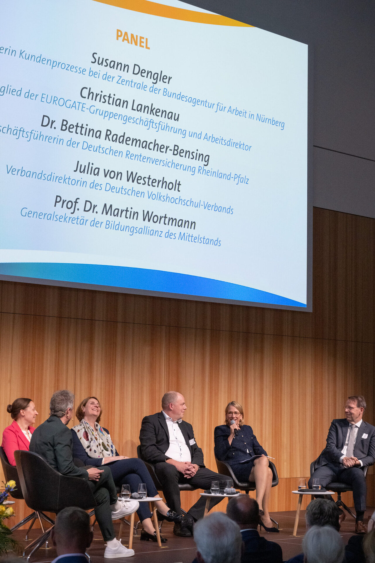 Eine Podiumsdiskussion mit Julia von Westerholt, Arbeitgebervertreter*innen sowie einer Vertreterin der Bundesagentur für Arbeit zum Thema „Future Skills: Gemeinsam das Morgen gestalten“ rundete den Festakt ab. Im Beisein von Bundesarbeitsministerin Bärbel Bas hob die DVV-Direktorin die Rolle der vhs bei der Vermittlung von Schlüsselkompetenzen mit hoher Relevanz für die agile Arbeitswelt und für das öffentliche Leben hervor. Zu den „Future Skills“ mit oberster Priorität zähle die Demokratiefähigkeit, betonte Julia von Westerholt: zu erlernen in der Volkshochschule, die sich überall in Deutschland als Ort des freien Meinungsaustauschs behauptet. „Volkshochschulen ermöglichen Menschen Begegnungen über die eigene Lebensrealität hinaus“. Die Bedingungen, unter denen Volkshochschulen arbeiten, werden ihrer Bedeutung jedoch nicht gerecht. Viele Volkshochschulen sind chronisch unterfinanziert. Große Sorgen bereitet den vhs auch die mangelnde Rechtssicherheit beim Einsatz selbständiger Lehrkräfte. Die zahlreichen Kursleiter*innen aus verschiedensten Bereichen der Arbeitswelt, die nebenberuflich unterrichten, bräuchten dafür eine klare Rechtsgrundlage, hob Julia von Westerholt hervor: Nur so sei die erfolgreiche Interaktion von Gesellschaft und Bildung in der vhs zu erhalten.