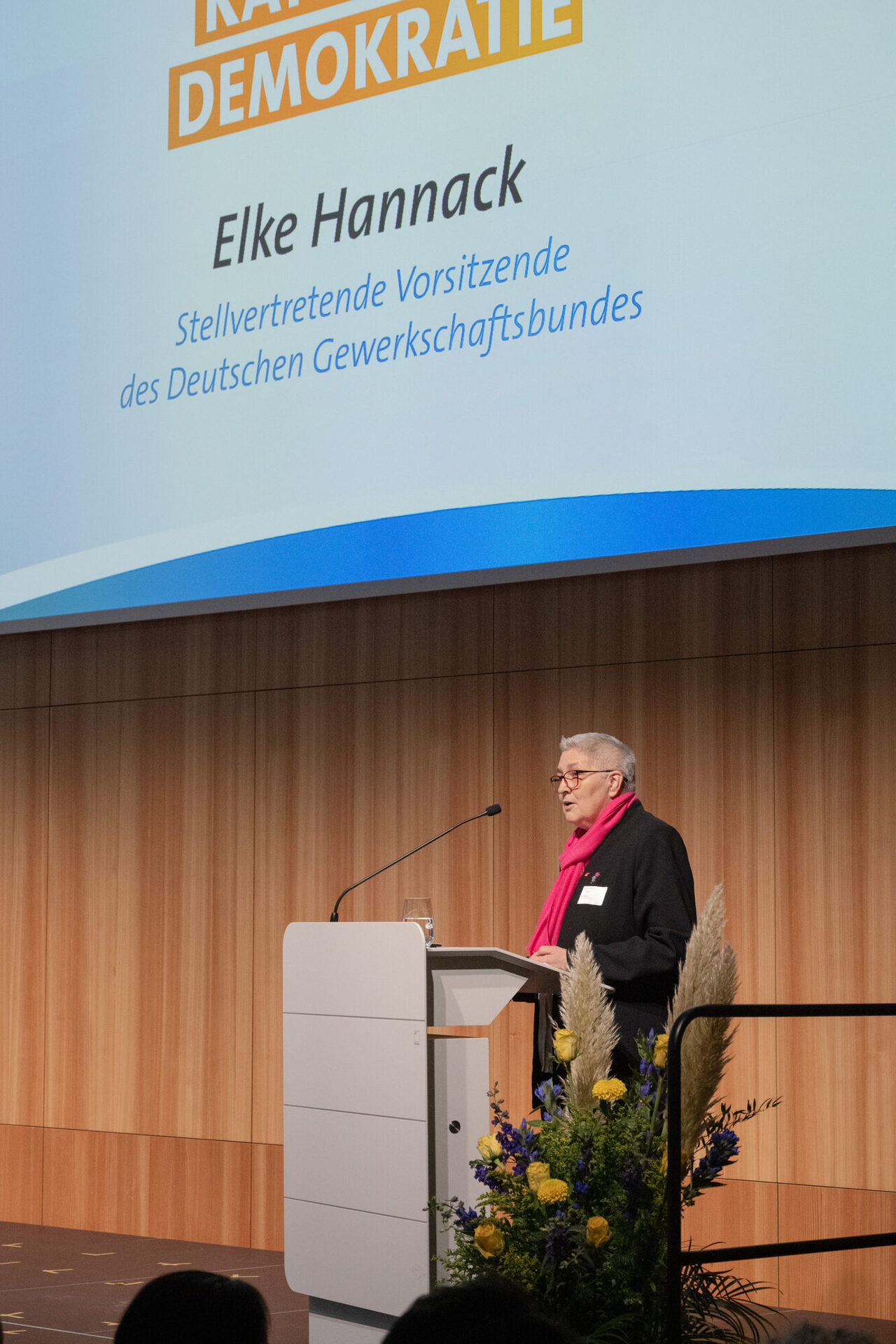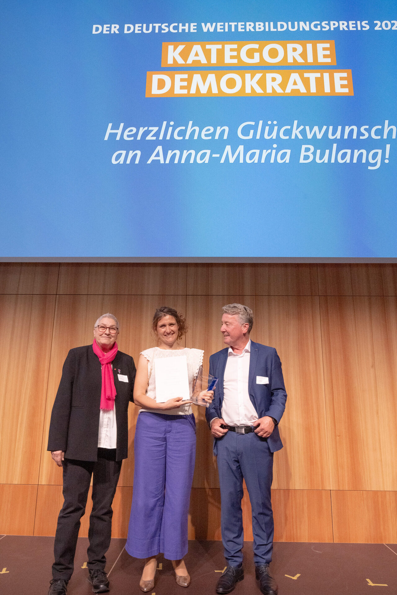 In der Kategorie Demokratieförderung ging der Titel an Anna-Maria Bulang von der vhs Hoyerswerda. Als Fachbereichsleiterin für Politische Bildung an der vhs Hoyerswerda sorgt sie mit der Veranstaltungsreihe „Schlossgespräche“ dafür, dass Menschen mit unterschiedlichen politischen Standpunkten ins Gespräch kommen. Damit macht sich die 36-Jährige nicht nur Freunde. Anna-Maria Bulangs Stehvermögen und die Bedeutung der Schlossgespräche für die lokale Gesellschaft würdigte Elke Hannack, stellvertretende Vorsitzende des DGB, in ihrer Laudatio. Dabei hatte sie auch die vielen anderen vhs im Blick, die bundesweit die Debattenkultur pflegen. In der Offenheit der vhs für alle liege „das Potenzial, den Menschen Kompetenzen zu vermitteln, die für das Zusammenleben in unserer Demokratie essenziell sind“, sagte Elke Hannack. „Die Vermittlung der Fähigkeit, Meinungsvielfalt in der pluralen Gesellschaft auszuhalten und mit Widerspruch umzugehen, gehört zu den Kernanliegen der politischen Bildung an Volkshochschulen. Die Auszeichnung für Anna-Maria Bulang macht allen Mut, die dieses Anliegen verfolgen.“