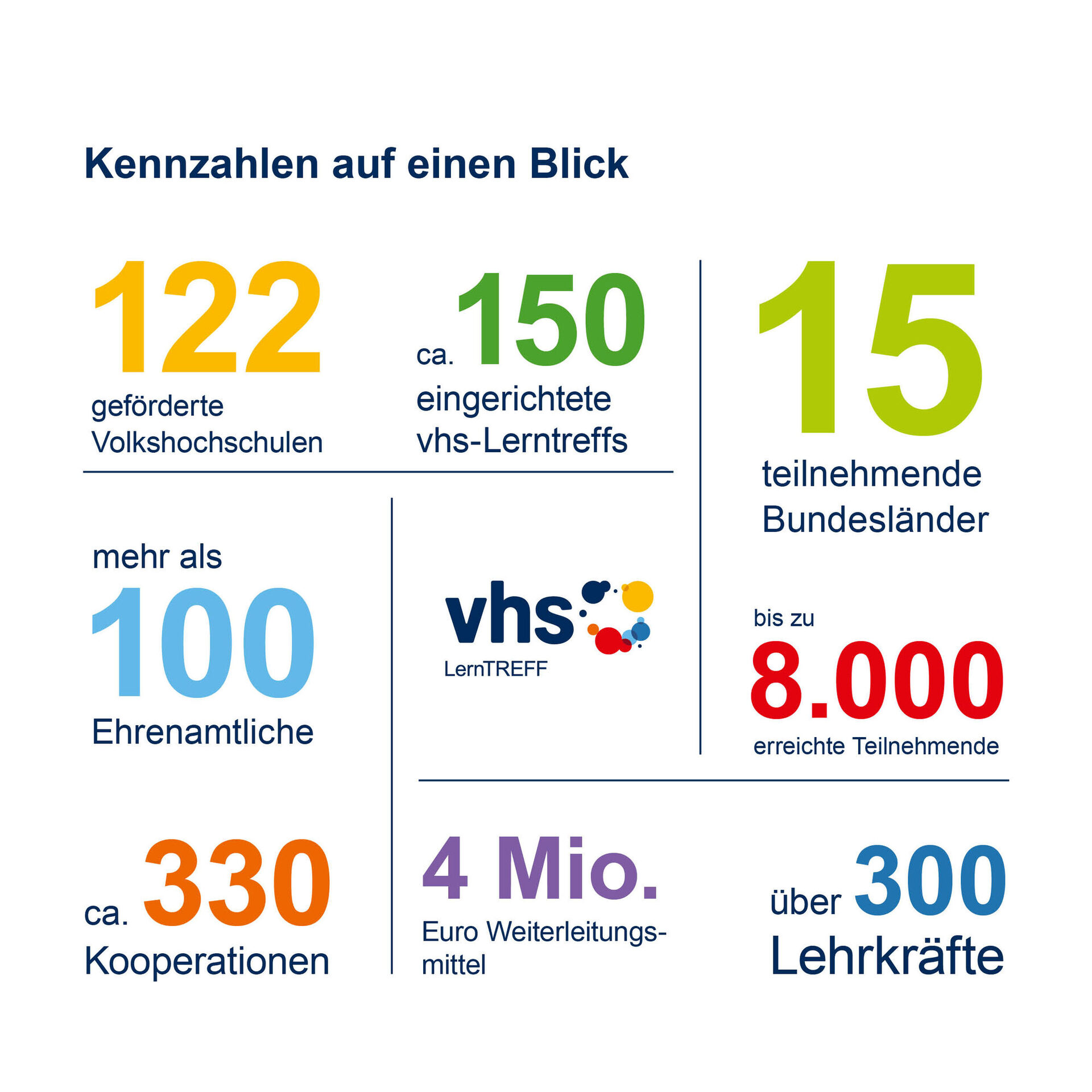 Das Projekt „vhs-Lerntreff im Quartier“ hat seine Ziele umfassend erreicht: Bundesweit wurden offene und niedrigschwellige Lernorte geschaffen, um Menschen mit Alphabetisierungs- und Grundbildungsbedarf direkt in ihrem Lebensumfeld zu erreichen. In der dreijährigen Projektlaufzeit leitete der Deutsche Volkshochschul-Verband (DVV) Mittel des jetzigen Bundesministeriums für Bildung, Familie, Senioren, Frauen und Jugend an Volkshochschulen weiter. Mithilfe einer Anschubfinanzierung in Höhe von bis zu 40.000 Euro pro Einrichtung richteten insgesamt 122 Volkshochschulen solche niedrigschwelligen Lernorte ein und etablierten sie vor Ort. Dies entspricht 14,6 Prozent aller Einrichtungen bundesweit.