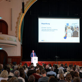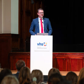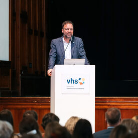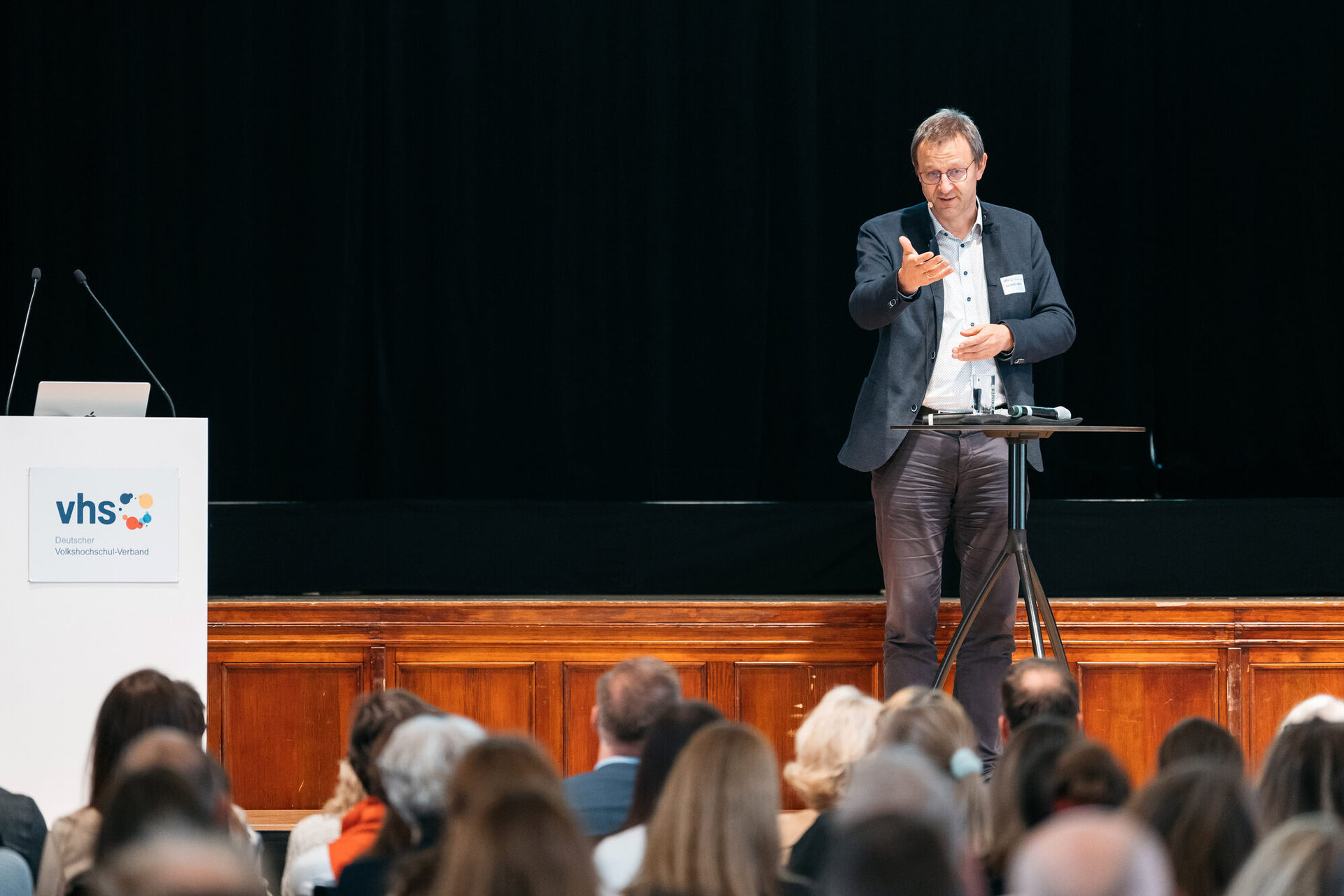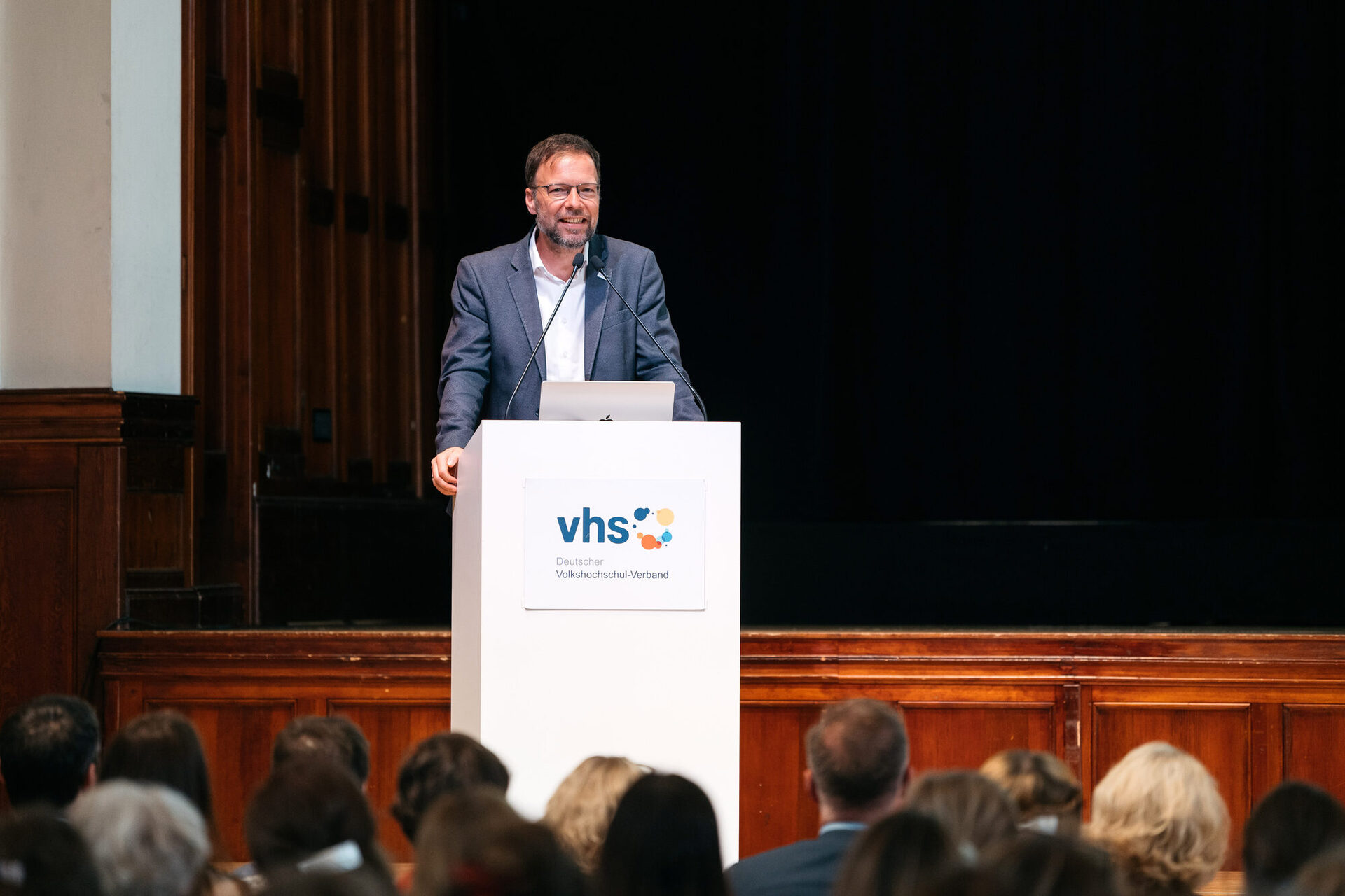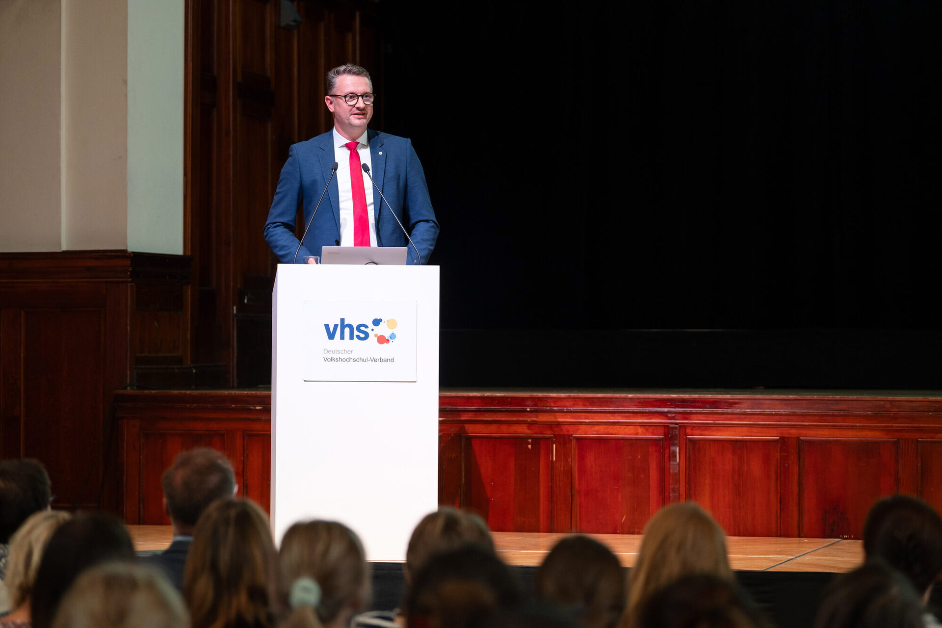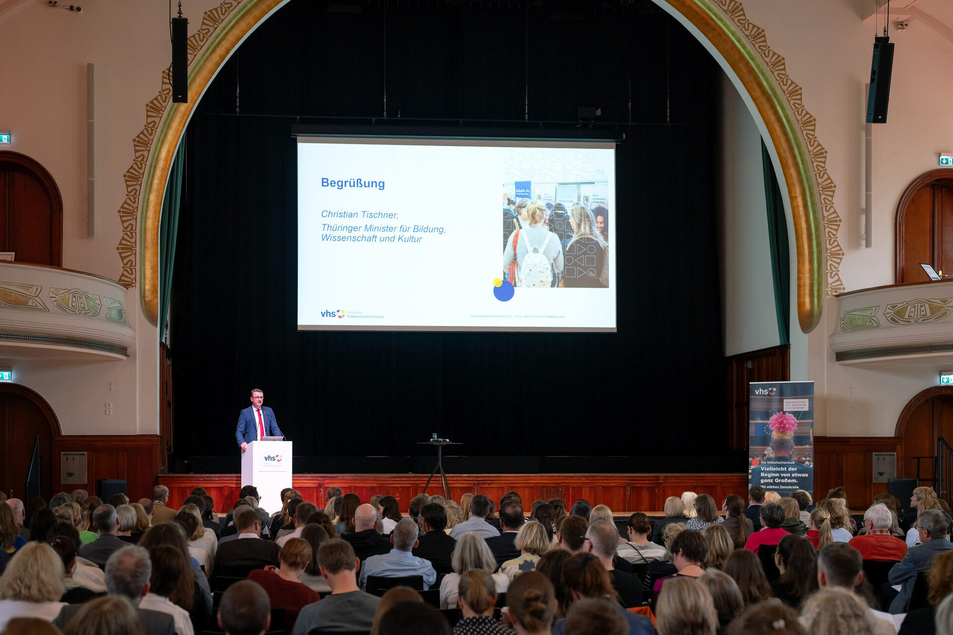 Der Thüringer Bildungs- und Wissenschaftsminister Christian Tischner betonte in seiner Begrüßung die zentrale Rolle der Volkshochschulen: „Die Volkshochschule ist die größte Weiterbildungsinstitution Deutschlands – und ein Ort des lebenslangen Lernens für alle. Das ist mehr als ein System – das ist eine Bewegung. Eine Bewegung für Bildung, für Teilhabe und für Zukunft.“