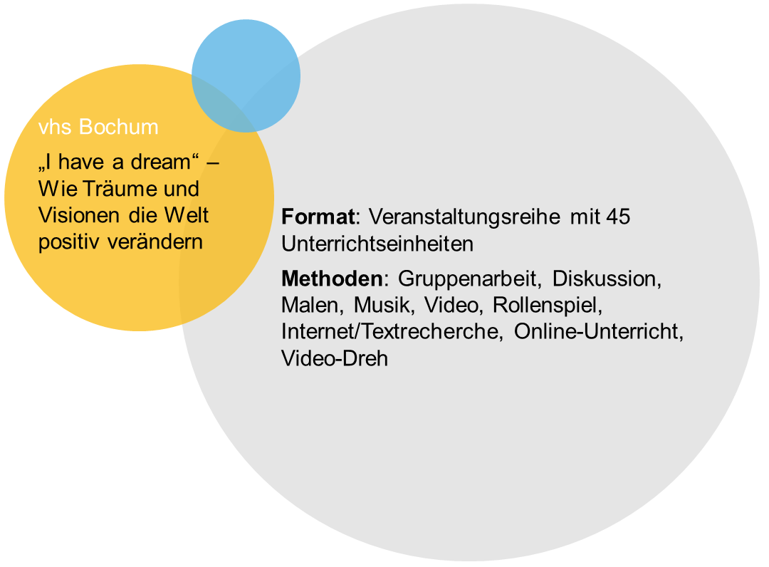An der Veranstaltung haben circa 20 Teilnehmende des zweiten Bildungswegs mit unterschiedlichen Bildungsständen, Erfahrungen, Sprachen, Kulturen und Religionen teilgenommen und sich durch eine globale Betrachtung mit zwei großen Blöcken auseinandergesetzt: In einem ersten Schritt haben sie sich mit Menschen beschäftigt, die in der weiteren oder jüngeren Vergangenheit mit ihren Träumen und Visionen die Welt nachhaltig positiv verändert haben. Anschließend wurden Träume und Visionen durch die Teilnehmenden selbst entwickelt. Ganz unter dem Motto: Was möchten sie wie in der Zukunft (ab jetzt) in der globalen Welt nachhaltig positiv verändern?
