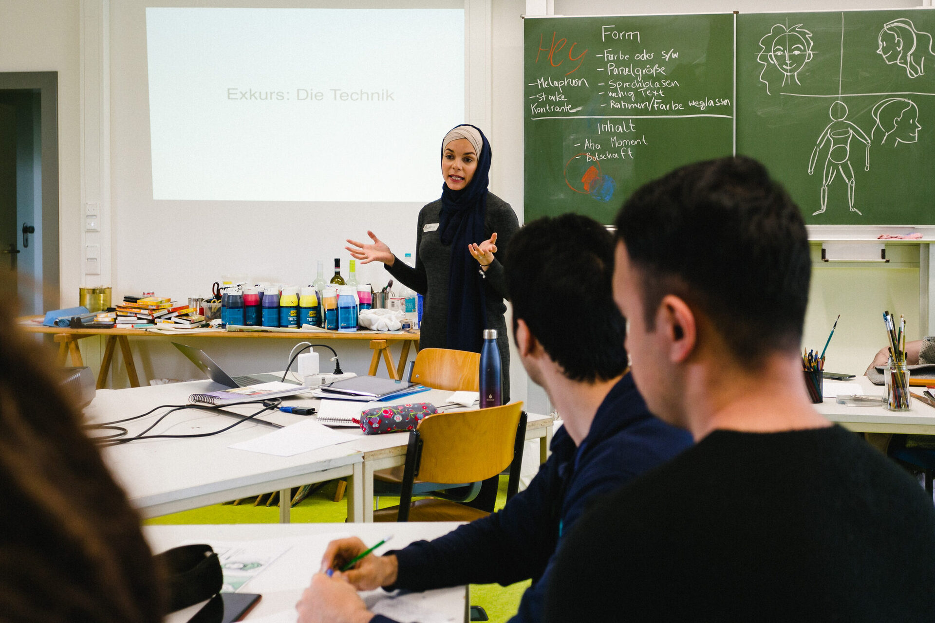 Die Psychologin und Cartoonistin Soufeina Hamed, alias „Tuffix“, konnte als Referentin gewonnen werden und gestaltete den ersten Workshoptag am 2. März 2020. Pädagogisch begleitet wurde sie dabei von einer Kunsterzieherin und vhs-Kursleiterin. Tuffix vermittelte den Jugendlichen zunächst Grundlagenwissen über Comics und stellte anschließend eine Auswahl ihrer eigenen Arbeiten vor. In Tuffix‘ Comics geht es häufig um Themen wie Identitätssuche, Rassismus und Islamophobie. Darüber kam sie dann auch mit den jugendlichen Teilnehmenden, die mehrheitlich eine Zuwanderungsgeschichte haben, ins Gespräch. Thema waren auch Geschlechterrollenbilder und Unterschiede in der Herkunfts- und in der Zuwanderungsgesellschaft. Durch die vielfältige Zusammensetzung der Gruppe kamen sehr unterschiedliche Perspektiven zur Sprache.