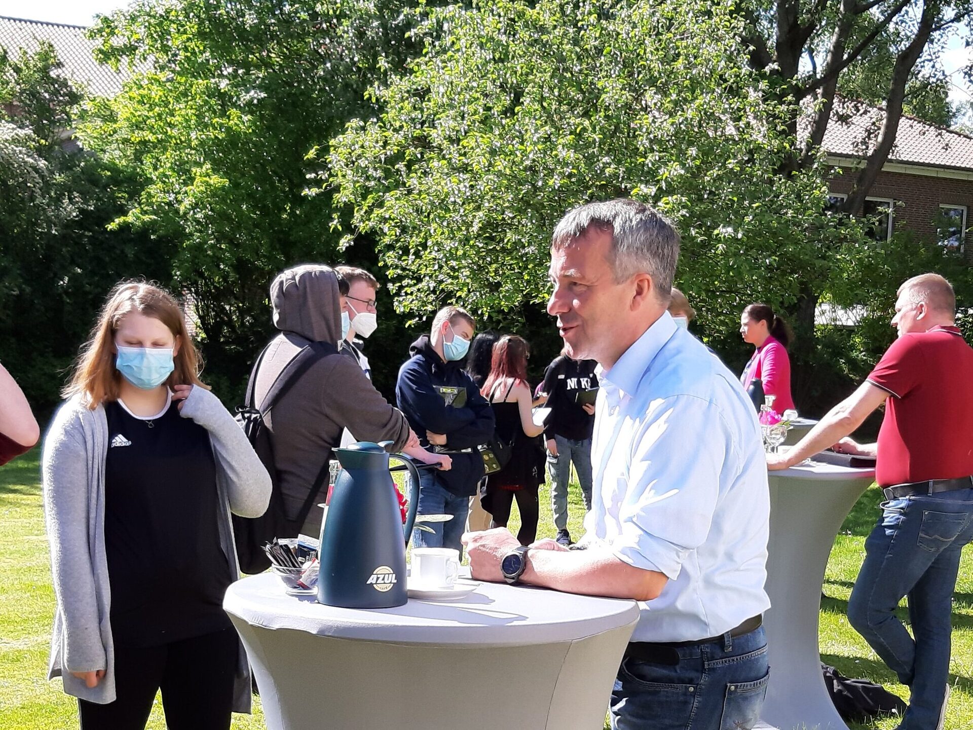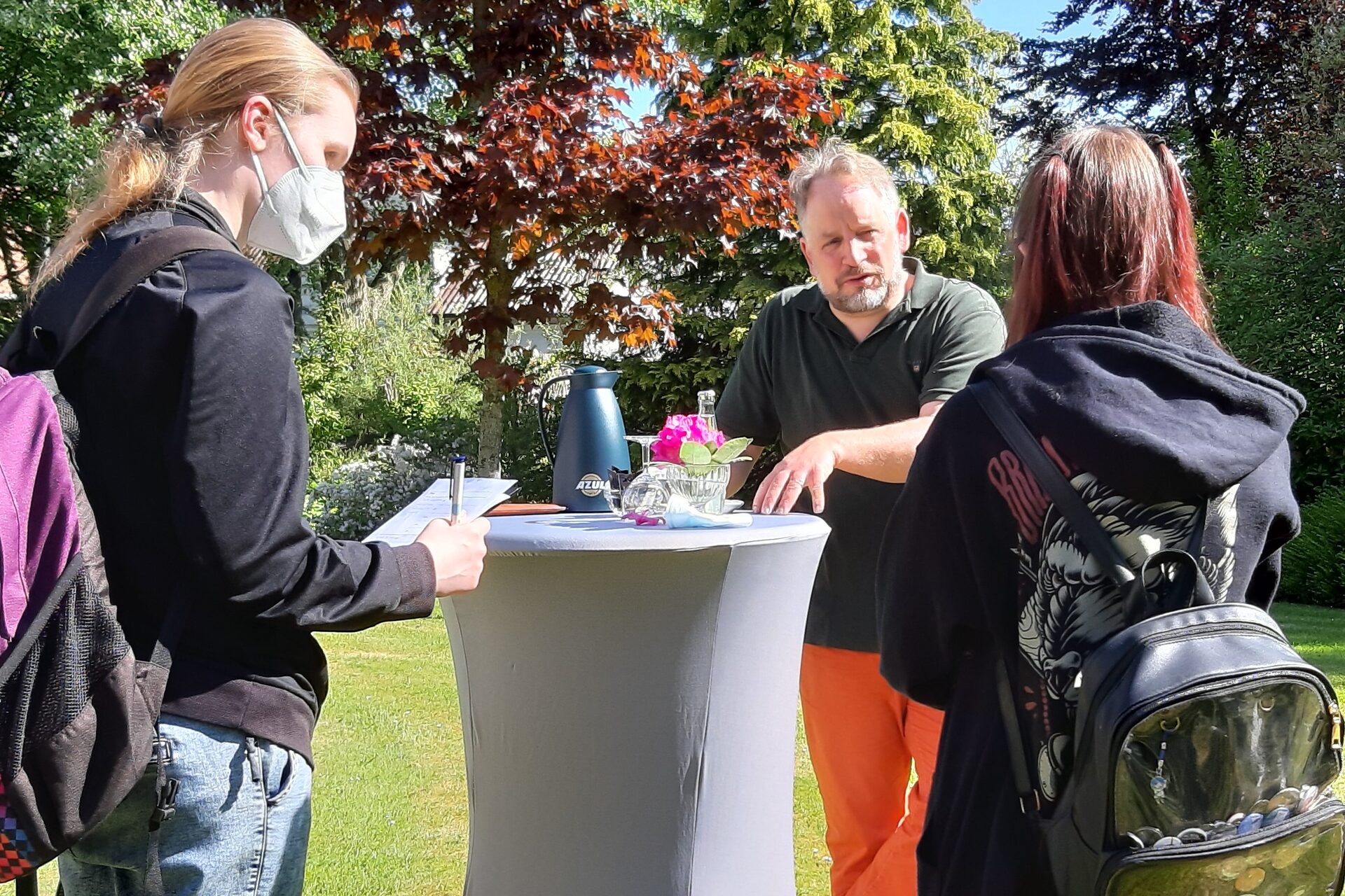 Auf diese 90-minütige Vorbereitungsphase folgte nach einer Pause das eigentliche Speeddating, bei dem die Bundestagskandidierenden von CDU, SPD, FDP und der Linken sowie die Kreisvorsitzende von Bündnis90/Die Grünen als Gesprächspartner*innen zur Verfügung standen. Für sie wurden auf einer Wiese Stehtische bereitgestellt. Die Jugendlichen fanden sich in neuen Gruppen von 3 bis 4 Personen zusammen und stellten jeweils einem oder einer Politiker*in ihre Fragen. Nach 15 Minuten erfolgte jeweils ein Wechsel, sodass alle Teilnehmenden die Möglichkeit hatten, mit allen Politiker*innen zu sprechen. Die vorbereiteten Fragen dienten dabei als roter Faden und die jungen Menschen machten sich Notizen zu den Antworten.