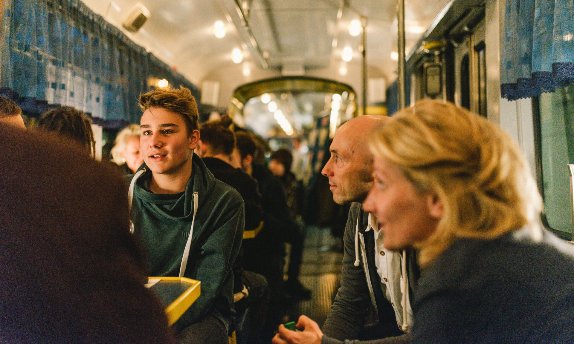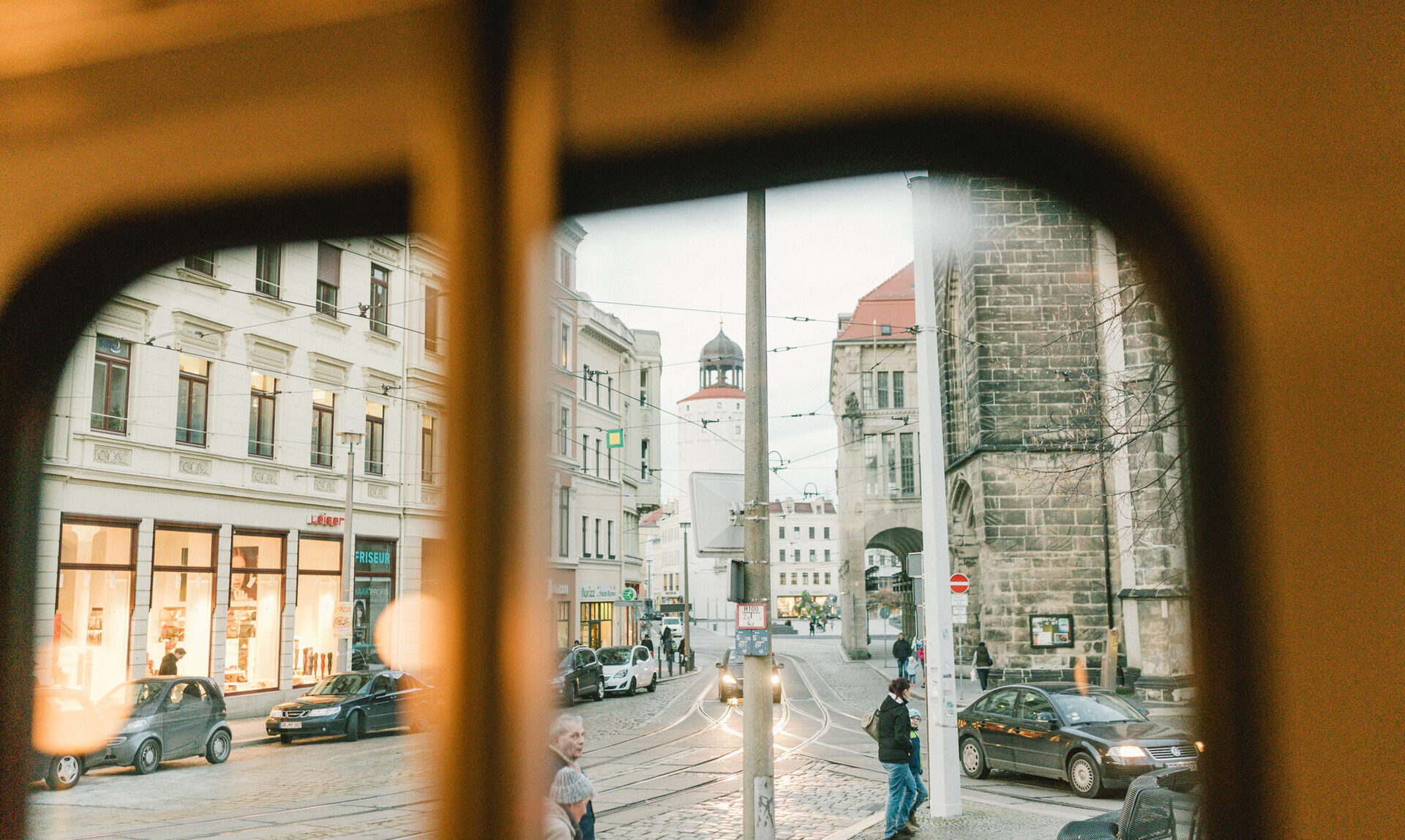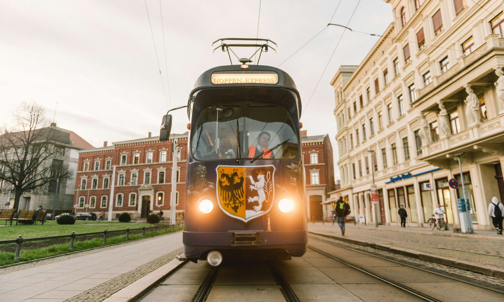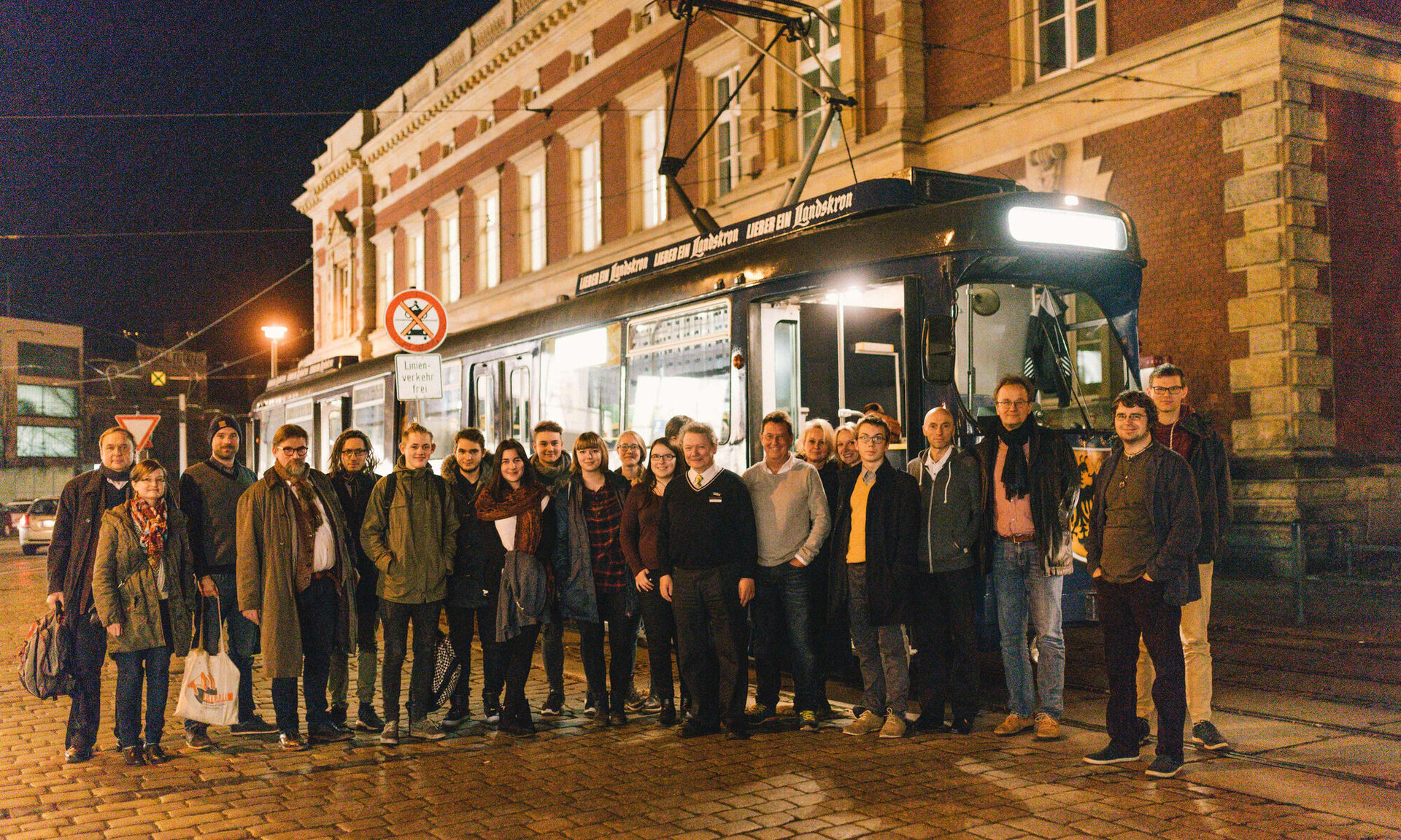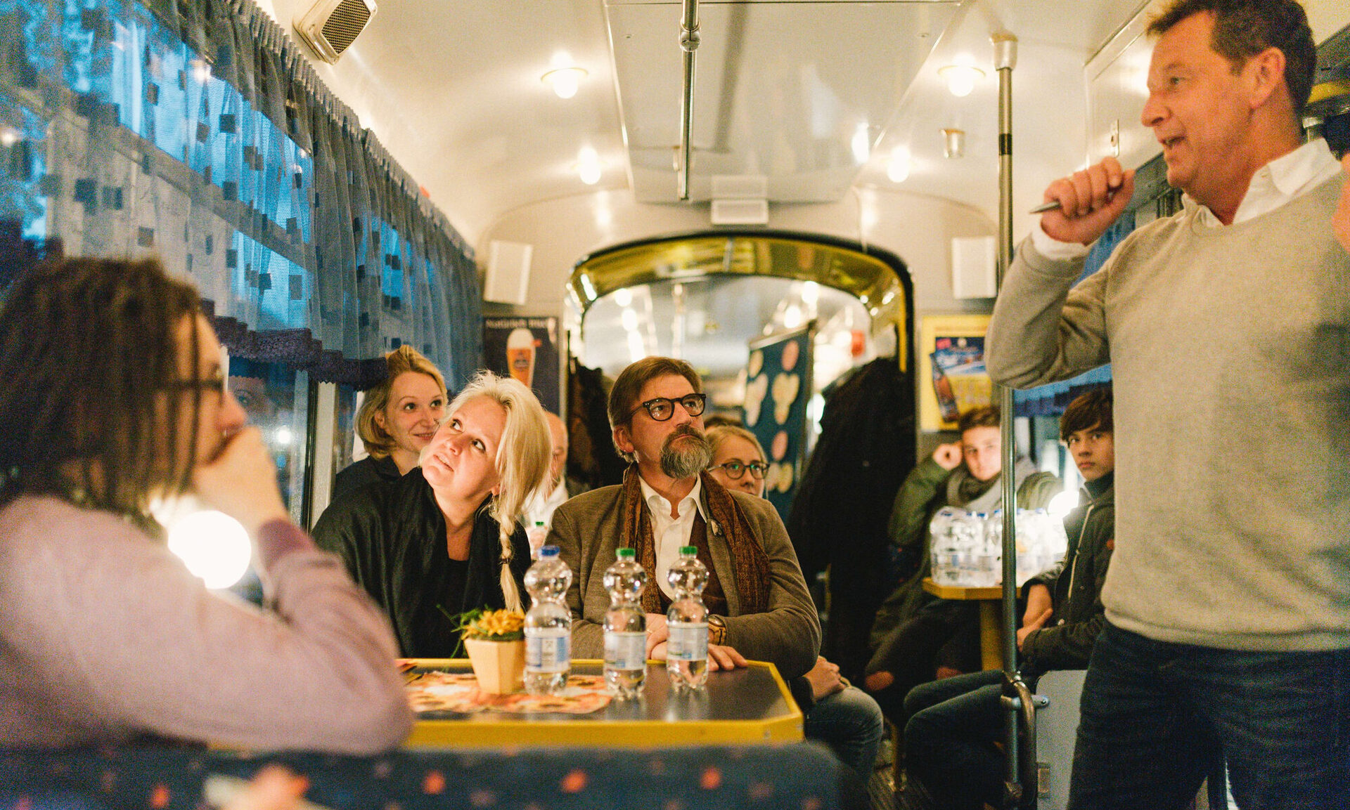 Nun stehen sie alle zusammen vor der Tram und frieren. „Hoffentlich ist die geheizt”, sagt der schniefende Professor und setzt zu einem sportlichen Sprint an, quer über die Straße zur gegenüberliegenden Apotheke. Als er wenige Minuten später wieder zurück ist, hat die gemischte Truppe die Bahn schon gestürmt. Meistens transportiert das mit Tresen, einer Bar und kleinen Bistrotischen ausgestattete Fahrzeug Feiergesellschaften. „Geburtstage, Firmenfeiern, wir hatten sogar schon eine Hochzeit”, sagt der freundliche Fahrer und klingelt zur Abfahrt.