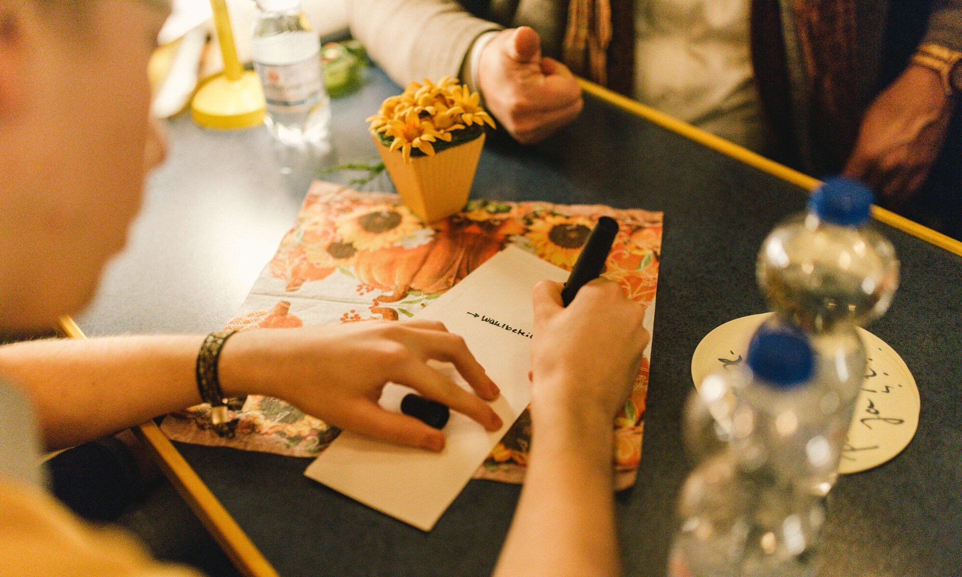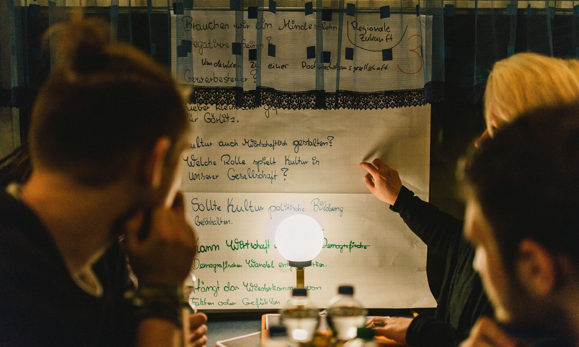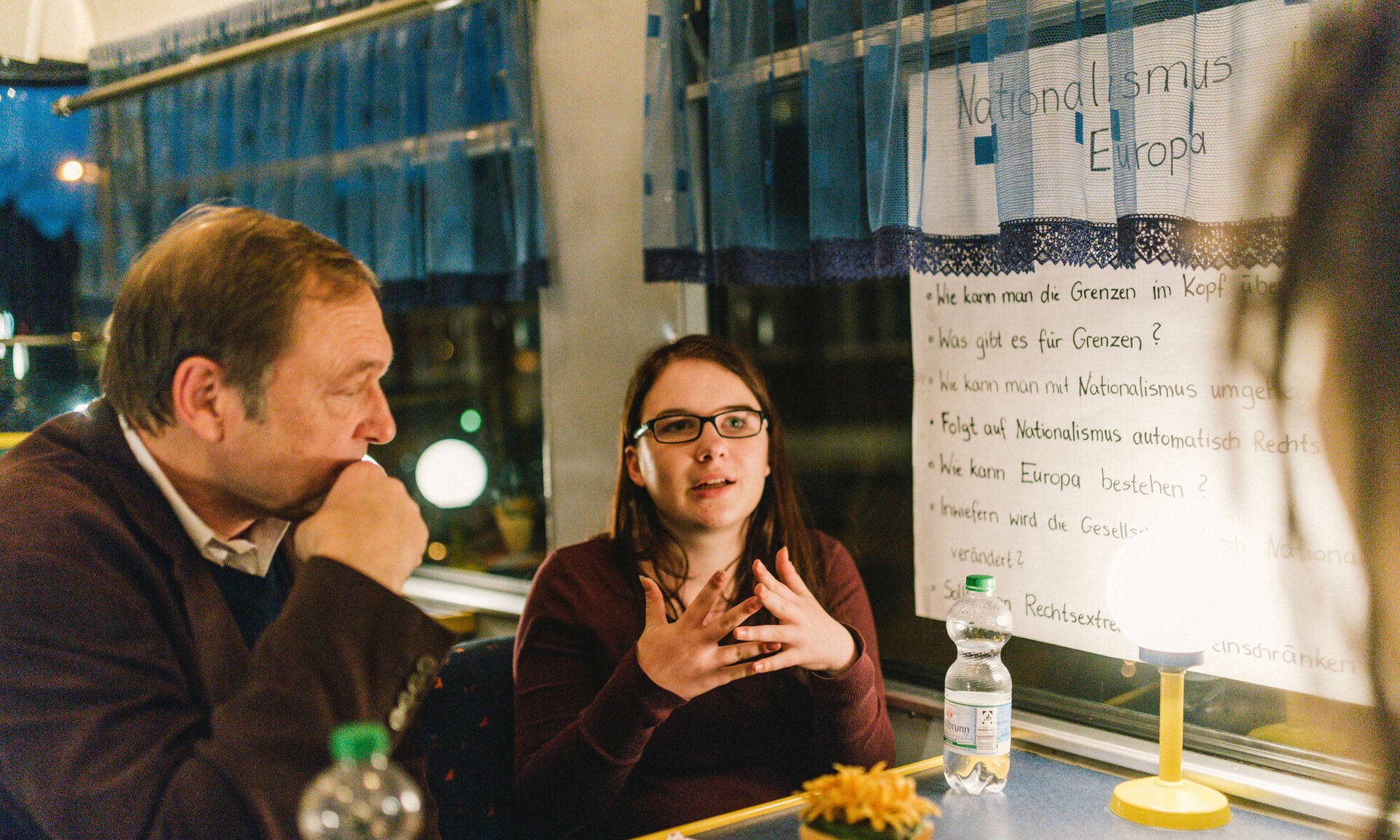 „Nationalismus in Europa” steht auf einem der handgeschriebenen Plakate. „Umwelt” auf einem zweiten. „Regionale Zukunft” und „Wahlen” sind die weiteren Themen, auf die sich die Experten jetzt verteilen. Jeweils eine Viertelstunde soll miteinander gesprochen werden, dann steht ein fliegender Wechsel an. „So hoffen wir auf eine größtmögliche Zahl von Begegnungen”, begründet Magda Langholz die an ein Speeddating erinnernde Versuchsanordnung. Und tatsächlich. Es klappt.