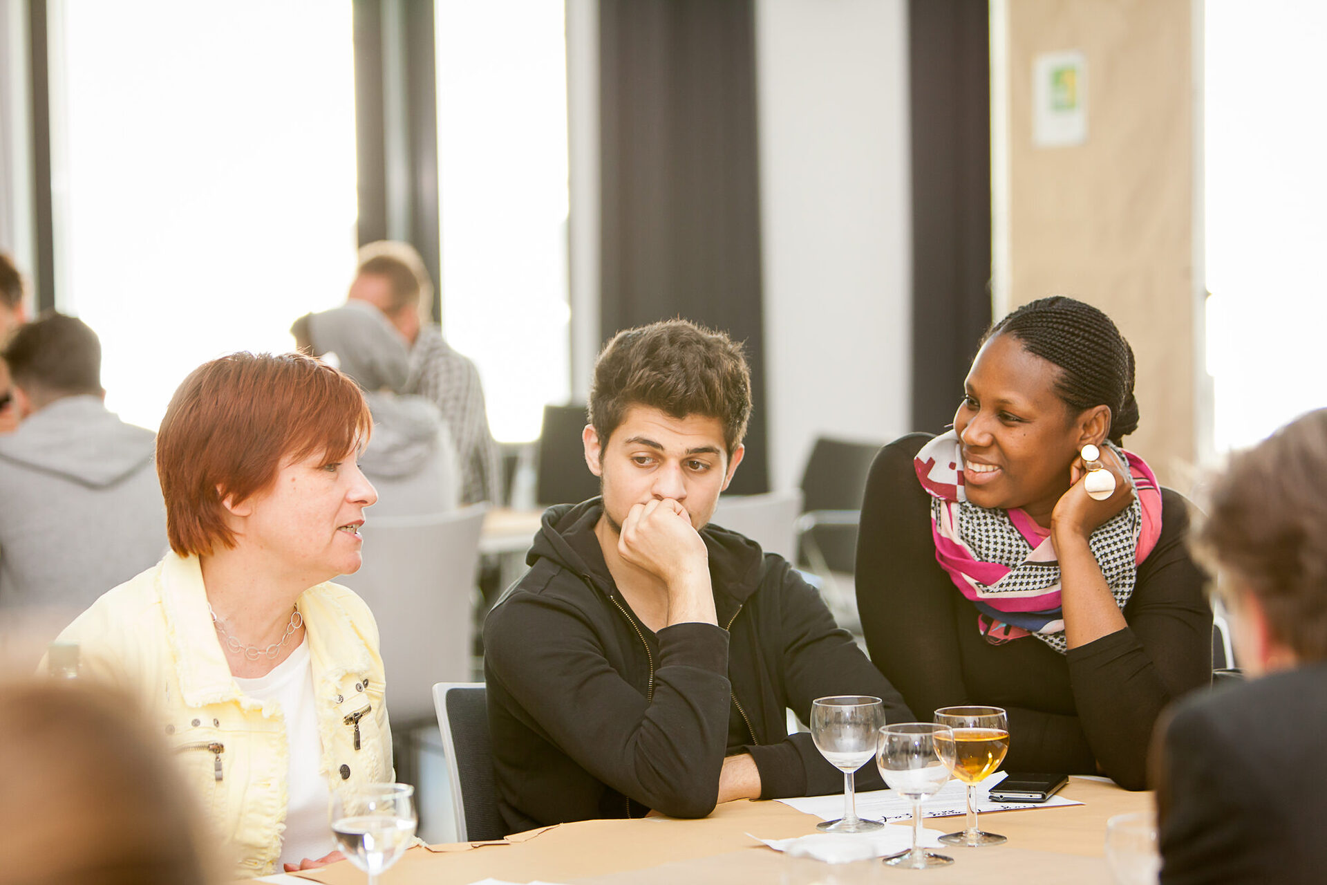 Die jungen Akteure haben sich im Rahmen eines eintägigen vhs-Kurses intensiv auf die Veranstaltung vorbereitet. Dabei wurden bedeutsame Themen identifiziert, aber auch kommunikative Fähigkeiten verfeinert, denn für viele Jugendliche ist eine solche Diskussionsrunde – zumal mit Persönlichkeiten, die mitunter rhetorisch geschult sind – doch eine ungewohnte Situation. Unterstützt wurden die jungen Leute während der Veranstaltung von Moderatorinnen und Moderatoren, die dafür sorgten, dass die Gespräche an den Tischen keinen einseitigen Verlauf nahmen und Jede bzw. Jeder seine Position vortragen konnte. Zudem war eine Gesamtmoderatorin dafür verantwortlich, durch die Veranstaltung zu führen, den Ablauf des World Cafés zu erklären, Tischwechsel anzusagen, Zwischenergebnisse grafisch zu dokumentieren und die abschließende Feedbackrunde zu moderieren.