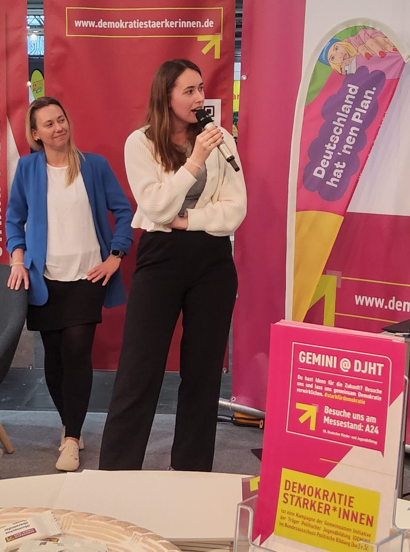 Einem breiteren Publikum wurde das Projekt von den beiden Verantwortlichen Antonia Streule (auf dem Foto rechts) und Julia Henschler (auf dem Foto links) im Rahmen des Deutschen Kinder- und Jugendhilfe-Tages im Mai 2025 vorgestellt – als Beispiel innovativer, künstlerisch-politischer Bildungsarbeit mit Jugendlichen.