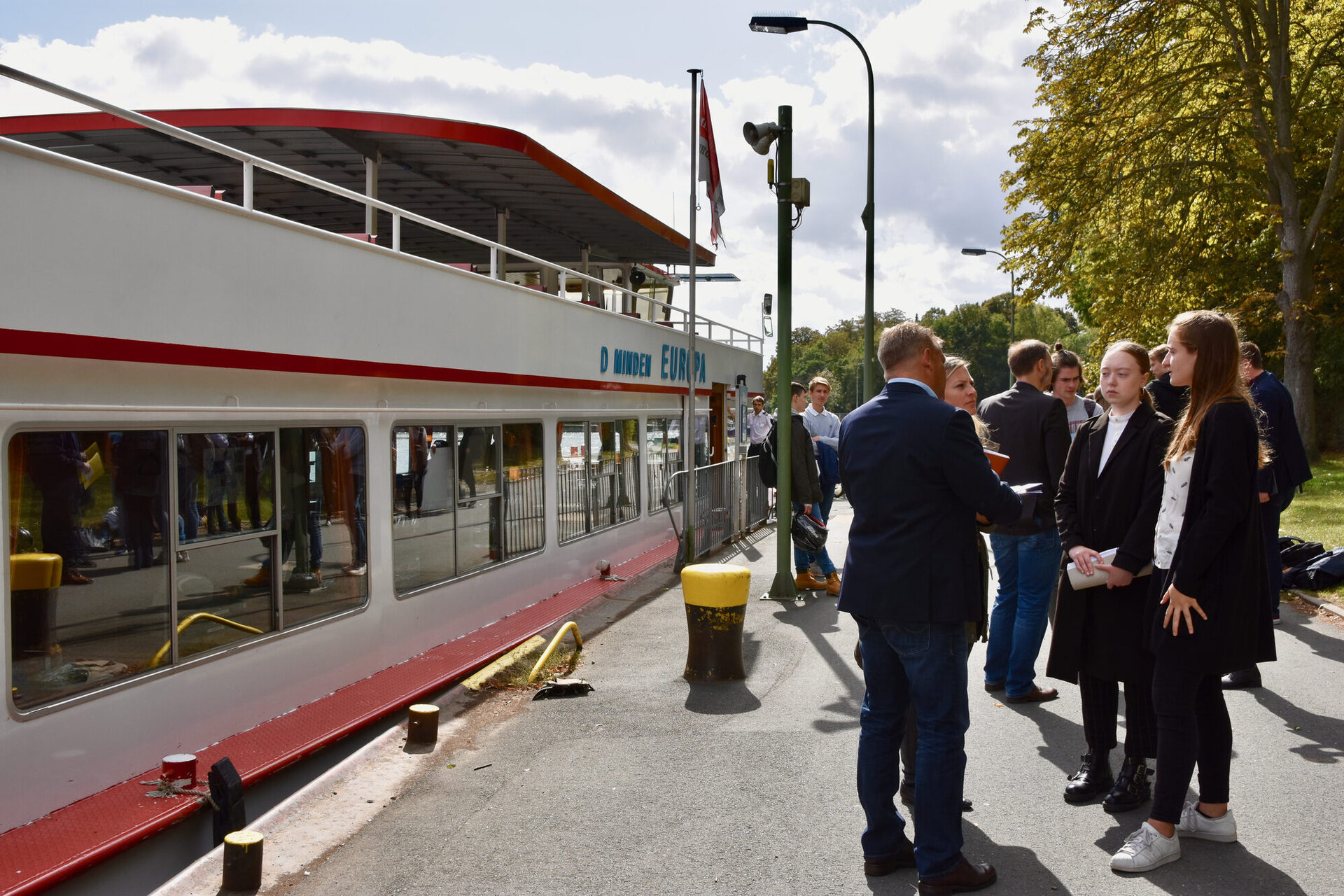Und so war das Passagierschiff MS Europa der richtige Ort, um über folgende Frage zu diskutieren: „Europa 2019: Alle in einem Boot?“. Rund 100 Schüler*innen der Oberstufe des Mindener Herder-Gymnasiums folgten der Einladung der vhs Minden zum Gespräch. Bei der Fahrt über die Weser trafen sie sich mit Expert*innen aus Politik, Kultur, Wissenschaft und Gesellschaft.