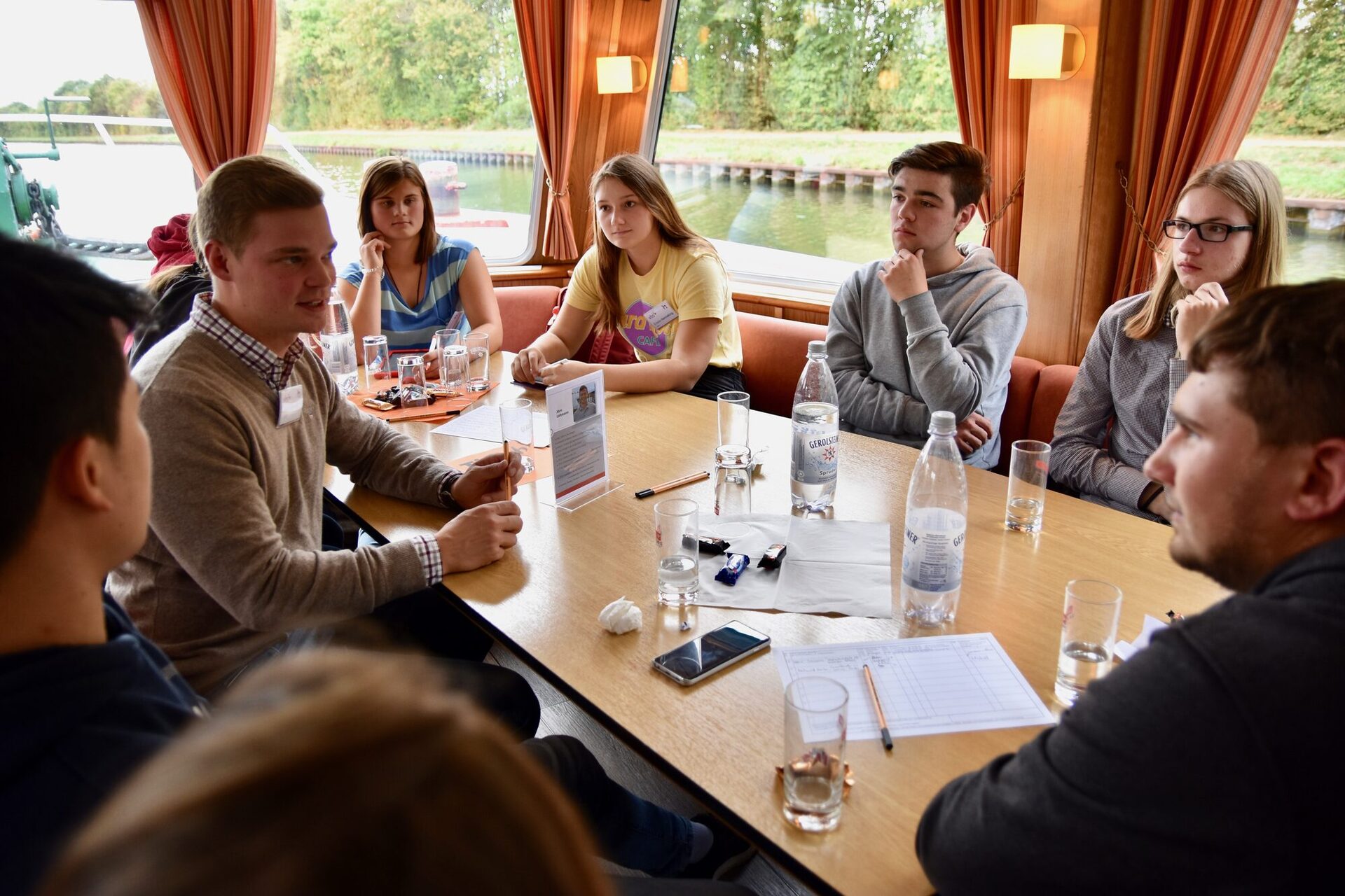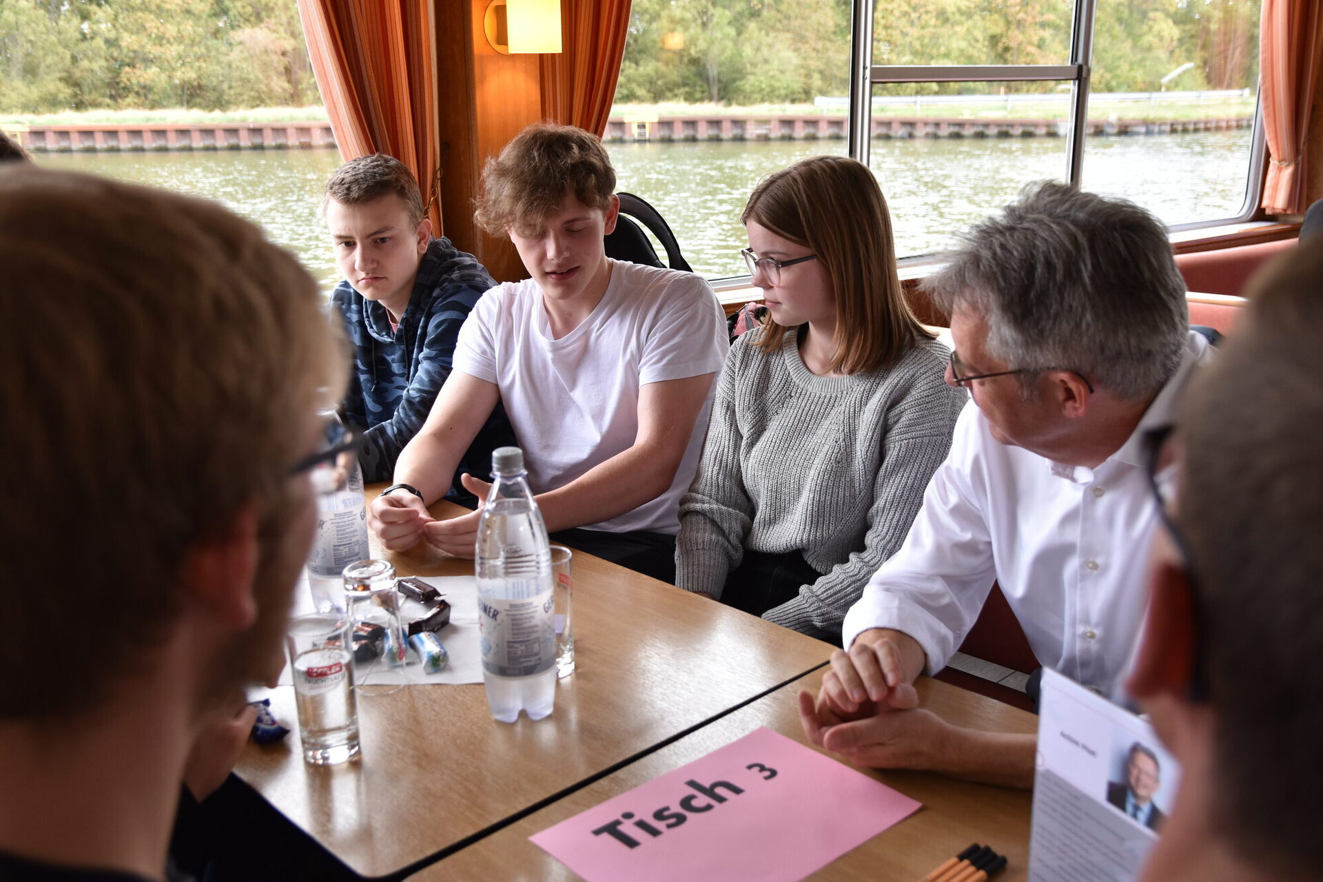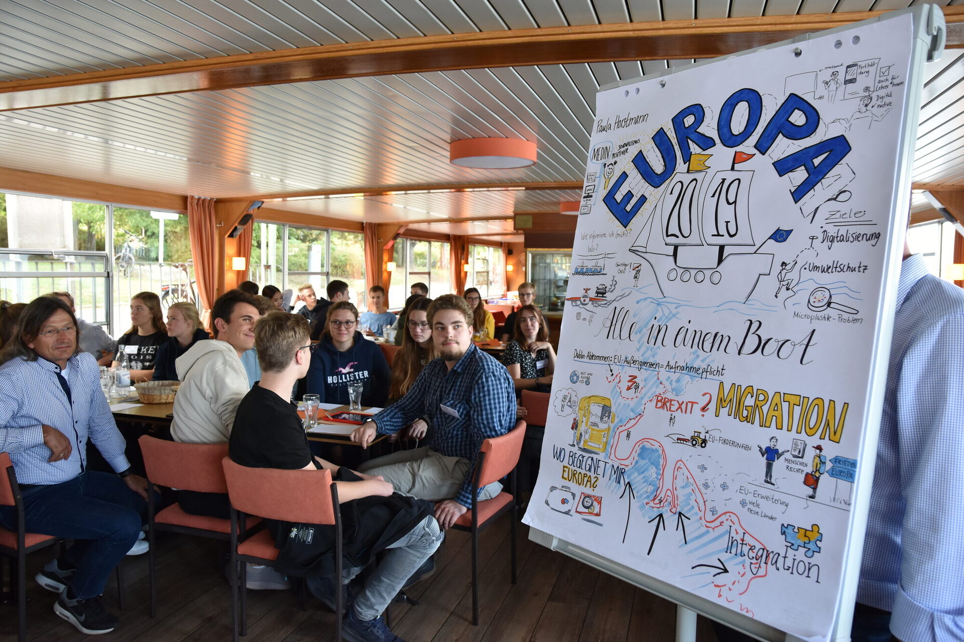 So gab es auf der MS Europa acht Thementische zu verschiedenen europäischen Fragen. Hier kamen die Jugendliche mit Fachleuten wie dem Europaabgeordneten Achim Post, Silke Mayer von der Umweltschutzorganisation WWF, dem ehemaligen Chefredakteur des Mindener Tageblatts Christoph Pepper oder Thomas Lange vom Verein Gedenkstätte Porta-Westfalica ins Gespräch.