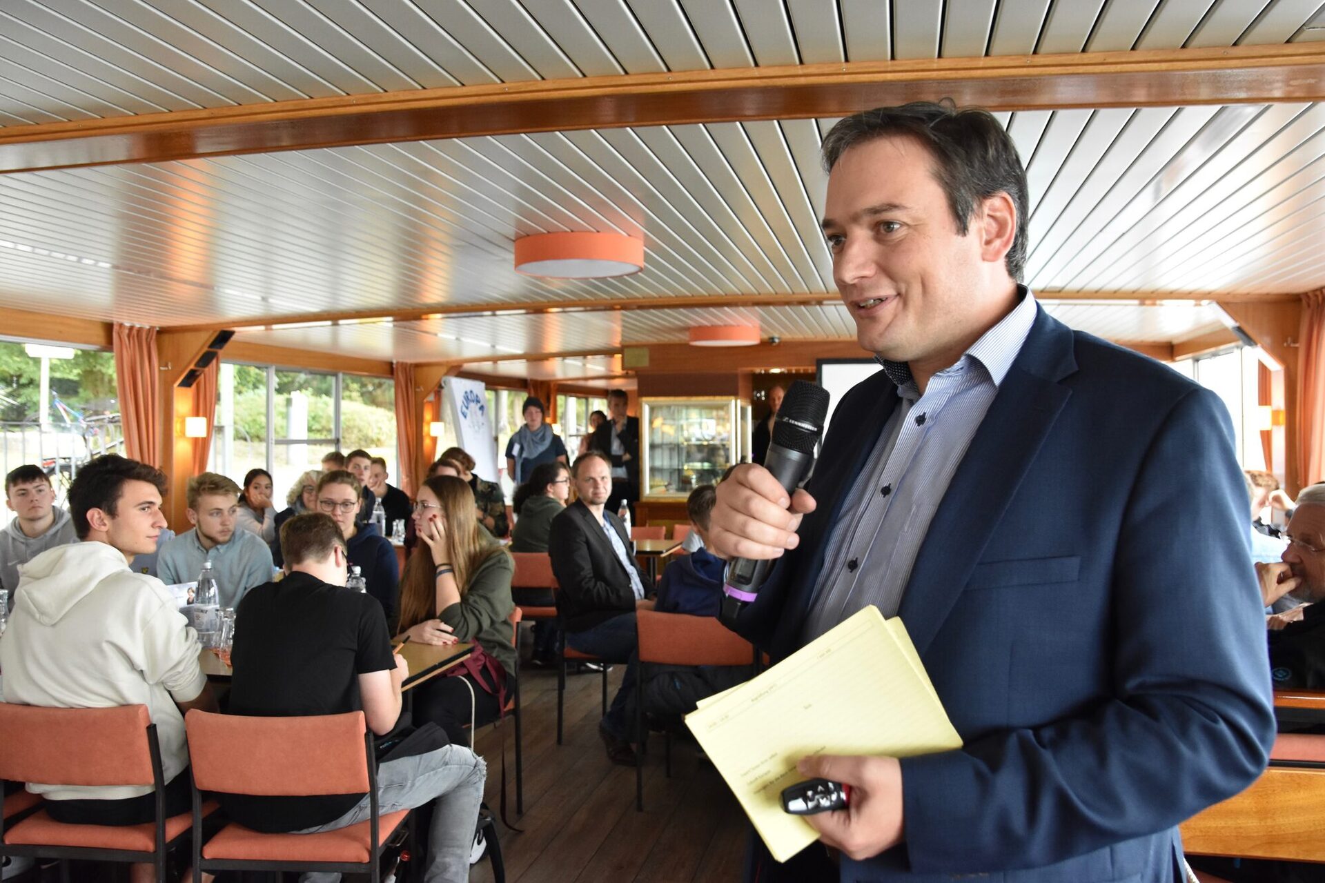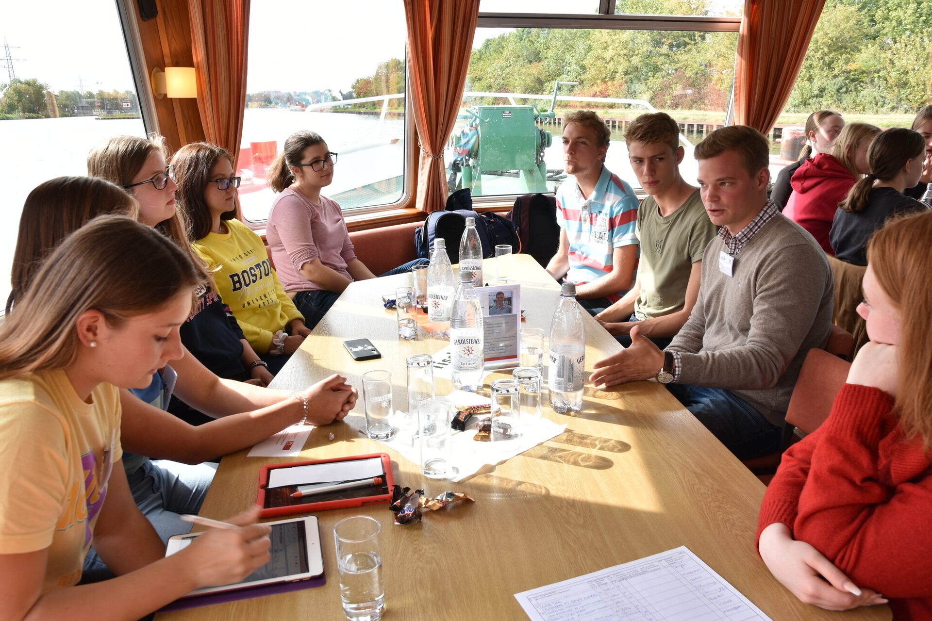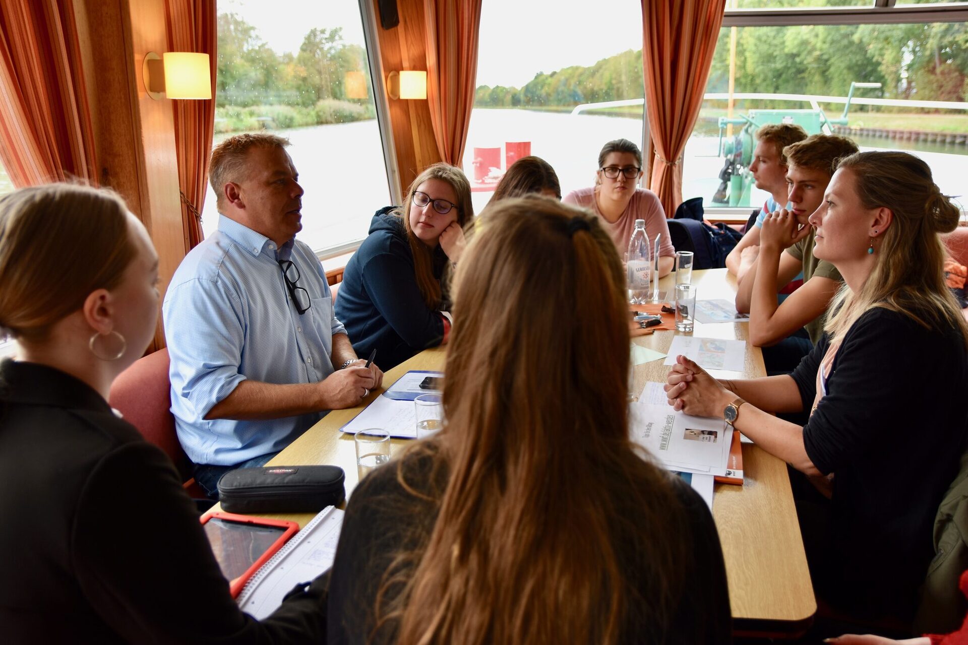 So gab es auf der MS Europa acht Thementische zu verschiedenen europäischen Fragen. Hier kamen die Jugendliche mit Fachleuten wie dem Europaabgeordneten Achim Post, Silke Mayer von der Umweltschutzorganisation WWF, dem ehemaligen Chefredakteur des Mindener Tageblatts Christoph Pepper oder Thomas Lange vom Verein Gedenkstätte Porta-Westfalica ins Gespräch.