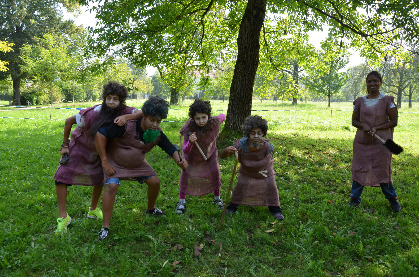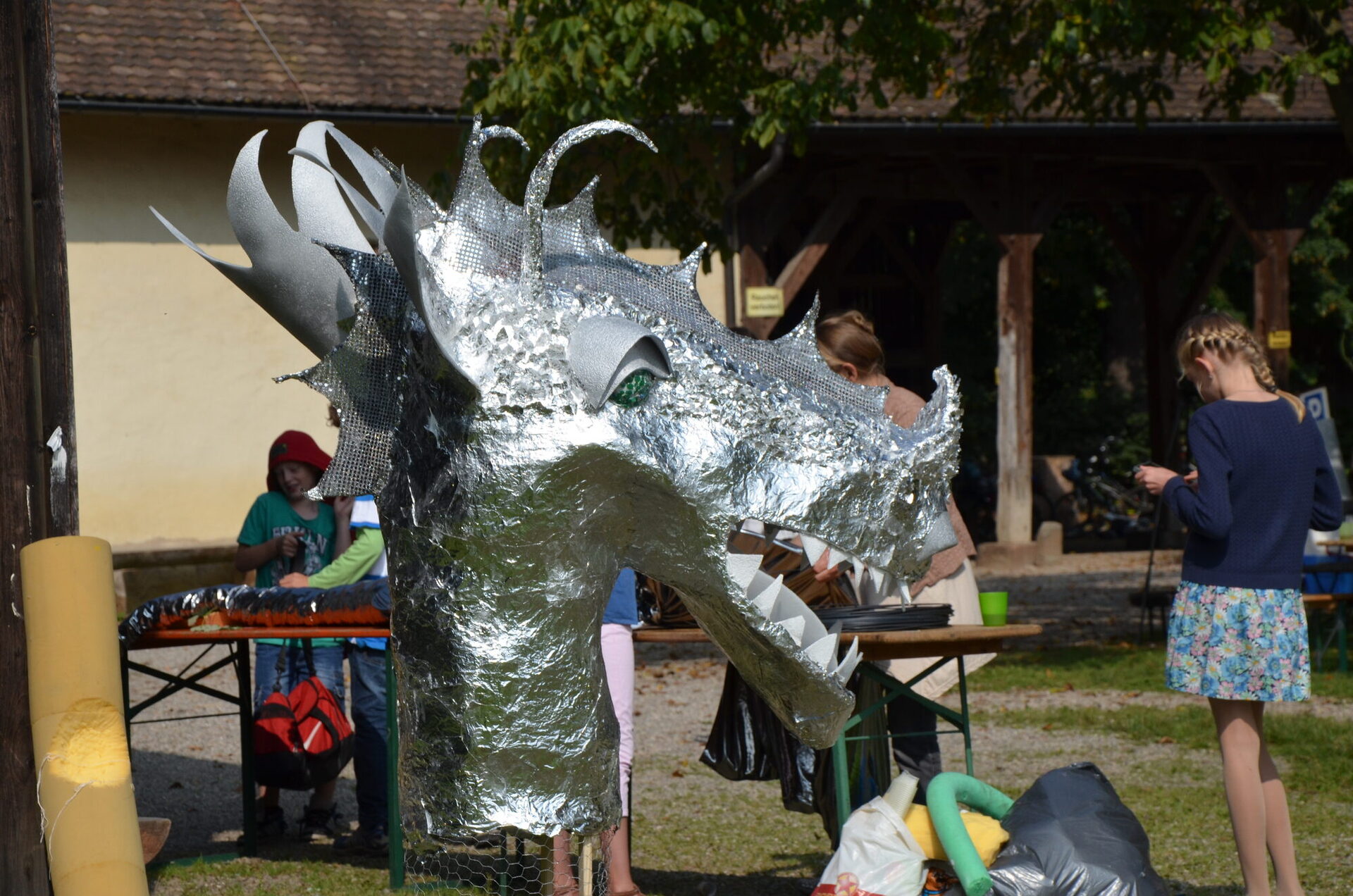 Jeden Morgen trafen sich die Kinder und Jugendlichen im Hof des Schlosses und erlernten gemeinsam den Tanz der Elfen. Im Vogelhof fanden Sprachkurse statt sowie die handwerkliche Herstellung eines großen Silberdrachen für die Darstellung des Drachenreiters. Im Theaterworkshop stimmten sich die Kinder und Jugendlichen auf das Schauspielen ein - abwechslungsreiche Improvisationsaufgaben, Stimme, Sprache und Körperbewegungen. Es wurde geschminkt und verkleidet, so dass am Ende viele kleine Elfen und Fabelwesen unterwegs waren.