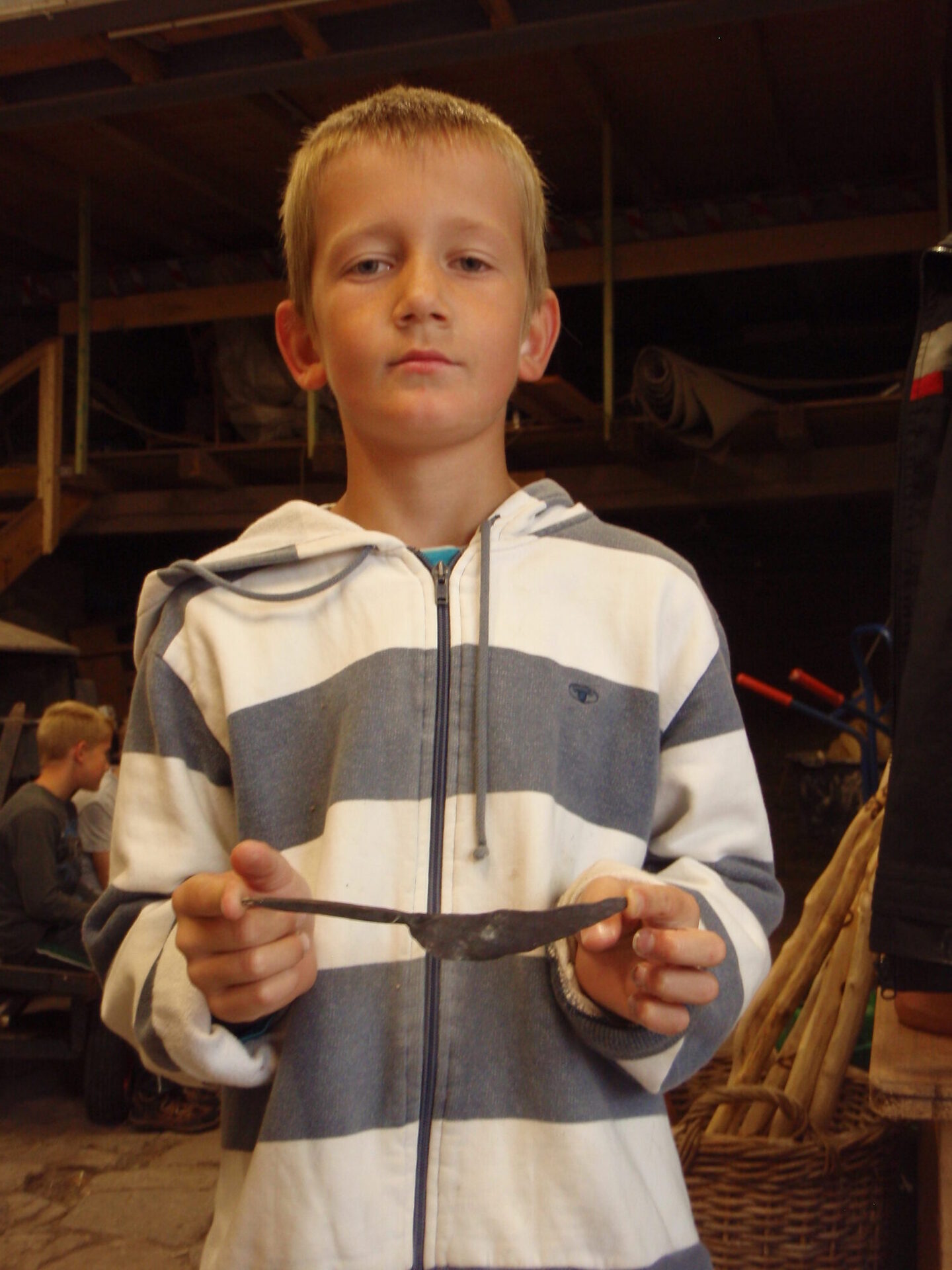 Eine andere Gruppe beschäftigt sich derweil mit altem Handwerk. Als Dozenten hat Torsten Werle das Ehepaar Büchel gewonnen, das im nahe gelegenen Neudorf den historischen Kunsthandwerkerhof Alte Pfarre betreibt. Die zehnjährige Charlotte hat eigenhändig einen Brotkorb geflochten. Den will sie ihrer Oma schenken. Ihr Zwillingsbruder Alexander hat ein Messer geschmiedet und ein Herz aus Speckstein geformt. „Schon die alten Wikinger haben aus Speckstein Schalen hergestellt“, erzählt Jörg Büchel. Er erklärt den Kindern die historischen Werkzeuge, für deren Handhabung man Geschicklichkeit und ein wenig Übung braucht. Seine Frau Kirsten zeigt den Kindern derweil, wie Filzen funktioniert.