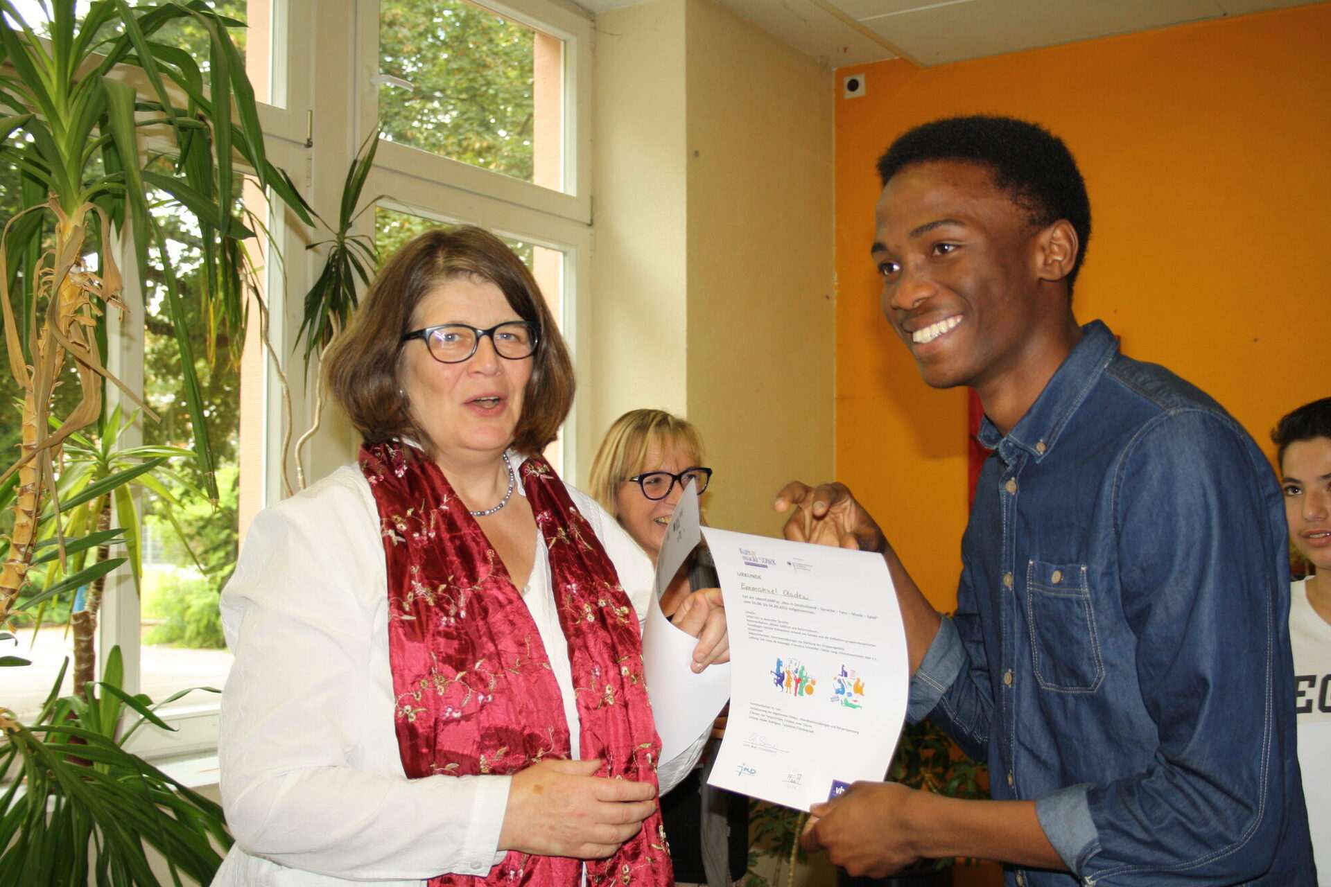 „Du musst unbedingt weiter singen“, sagt Bürgermeisterin Angelika Birk, Bildungsdezernentin der Stadt Trier. Mit ihrem Appell an die 13-jährige Arlinda aus dem Kosovo spricht sie den rund 50 Anwesenden aus dem Herzen. Denn die sind ganz verzaubert von Arlindas schöner Stimme. Kurz zuvor hat sie im Duett mit dem 17-jährigen Emanuel aus Nigeria und mit Gitarrenbegleitung des Deutschdozenten Fabian Lang den Rihanna-Hit „Four Five Seconds“ vorgetragen. Bei der Abschlussveranstaltung im Bürgerhaus Trier-Nord offenbart der talentCAMPus der Volkshochschule Trier so die Talente seiner Teilnehmer.