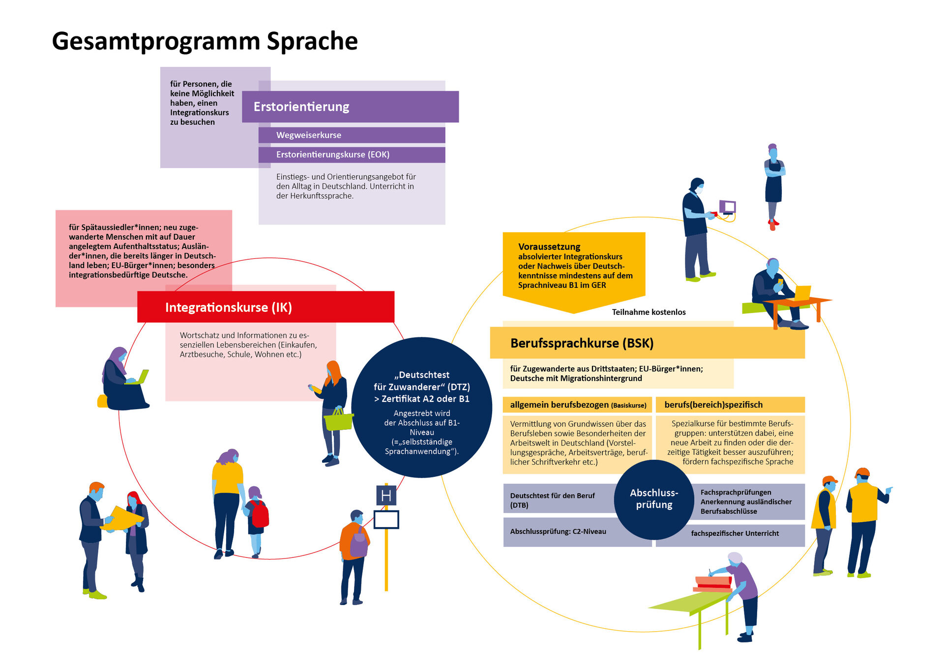 Das Netzwerk der rund 827 kommunal verantworteten Volkshochschulen, die in Landesverbänden und im DVV zusammengeschlossen sind, steht mit seinen umfassenden Beratungs- und Bildungsangeboten zur sprachlichen, beruflichen und gesellschaftlichen Integration zugewanderter Menschen Bund, Ländern und Kommunen flächendeckend zur Seite. Mit dem Gesamtprogramm Sprache (GPS) (Öffnet in einem neuen Tab), das aus Integrations- und Berufssprachkursen besteht, hat der Bund ein zentral gelenktes Kurssystem PDF-Datei 175,78 kB für die sprachliche und berufliche Integration von Zugewanderten geschaffen. Fast 45% aller Integrationskurse werden derzeit von Volkshochschulen durchgeführt. Volkshochschulen leisten seit 20 Jahren einen unverzichtbaren Beitrag bei der Vermittlung deutscher Sprachkenntnisse und bei der Integration in die Lebenswelt und den Arbeitsmarkt in Deutschland.