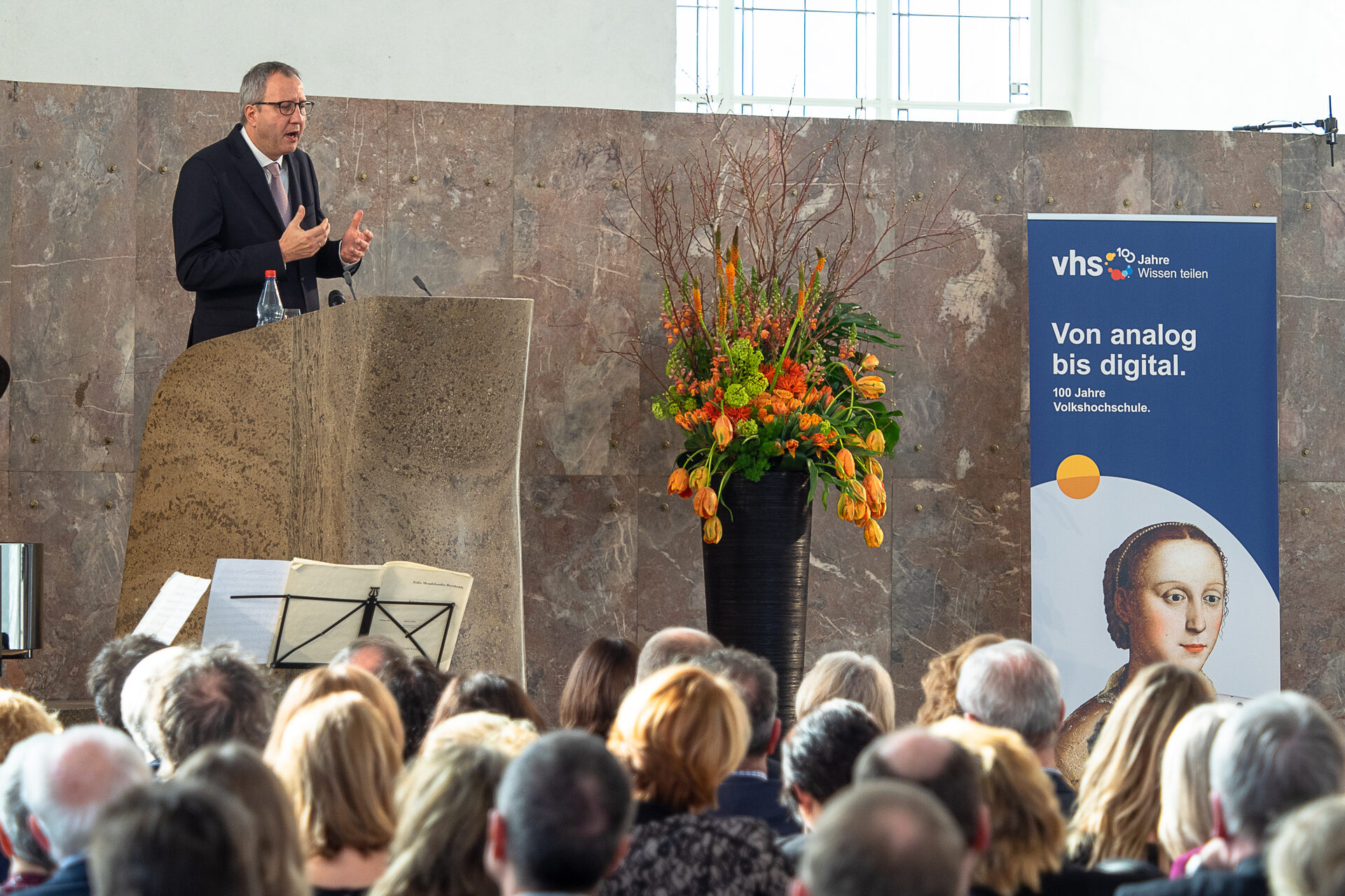 Eine komplexer werdende Welt braucht aufgeklärte Bürger. Aufgeklärte Bürger sind neugierig. Das ist das Staatsbürgerideal des Grundgesetzes. Dieser selbstbestimmte, zur kritischen Reflektion fähige, neugierige Bürger des Grundgesetzes steht der modernen Welt nicht hilflos gegenüber. Wenn wir heute 100 Jahre Volkshochschule feiern, ehren wir genau diesen Geist. Die Idee der Volkshochschule steht für eine Einrichtung, die Neugier stillen will, und für die Bildung nicht mit dem Schulabschluss beendet ist. Mit anderen Worten, ein Ort des Dialogs und der Offenheit für Neues – auch für ältere Generationen.