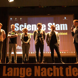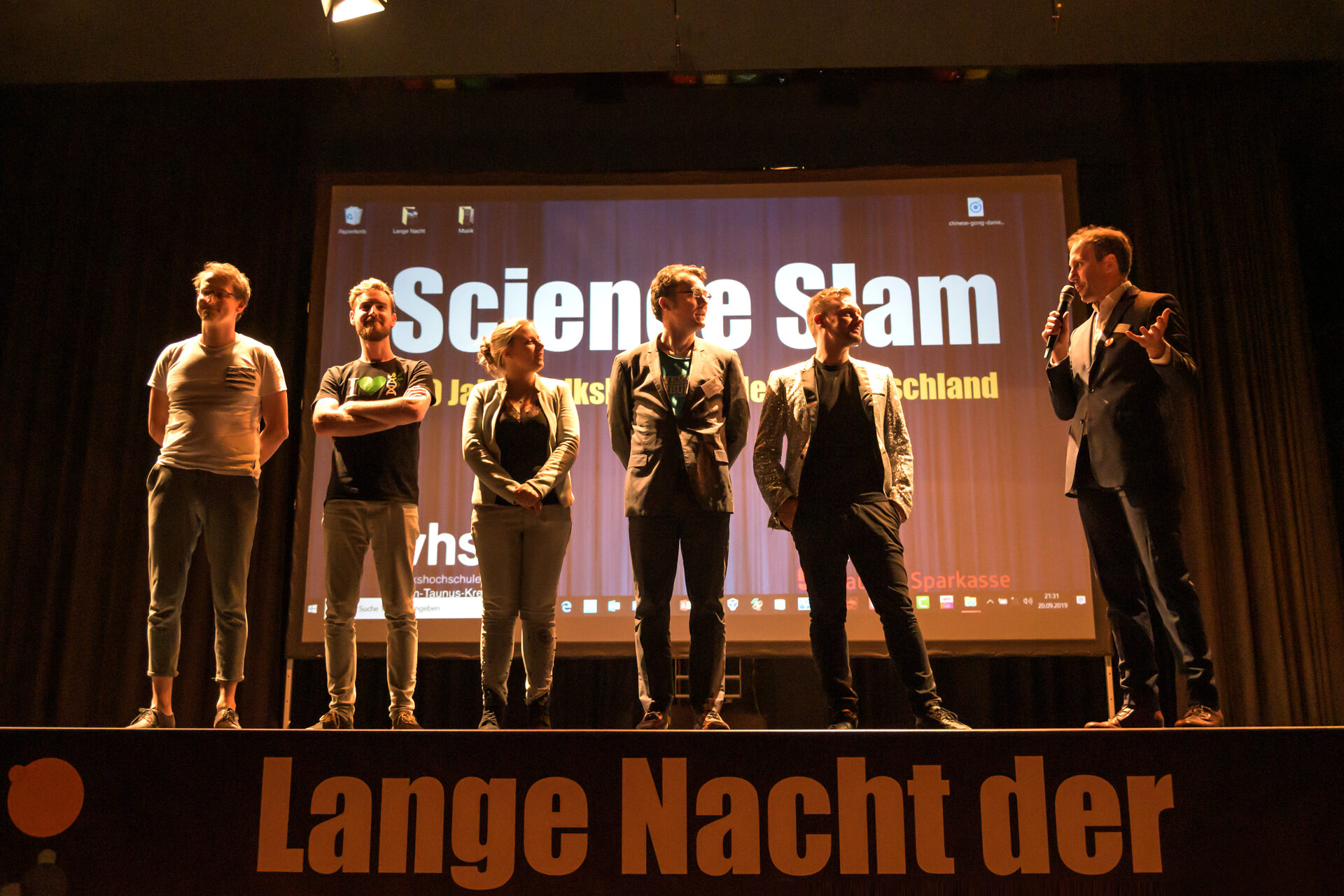Ein Science-Slam der vhs Main-Taunus-Kreis, der in Hofheim veranstaltet wurde, fand ein ungewöhnliches Ende: Der Moderator des Abends, Fachbereichsleiter für Kultur, hatte Mühe den beliebtesten Beitrag der insgesamt fünf Slammer anhand des stürmischen Beifalls zu küren. So gab es am Ende des Abends einen geteilten ersten Platz.