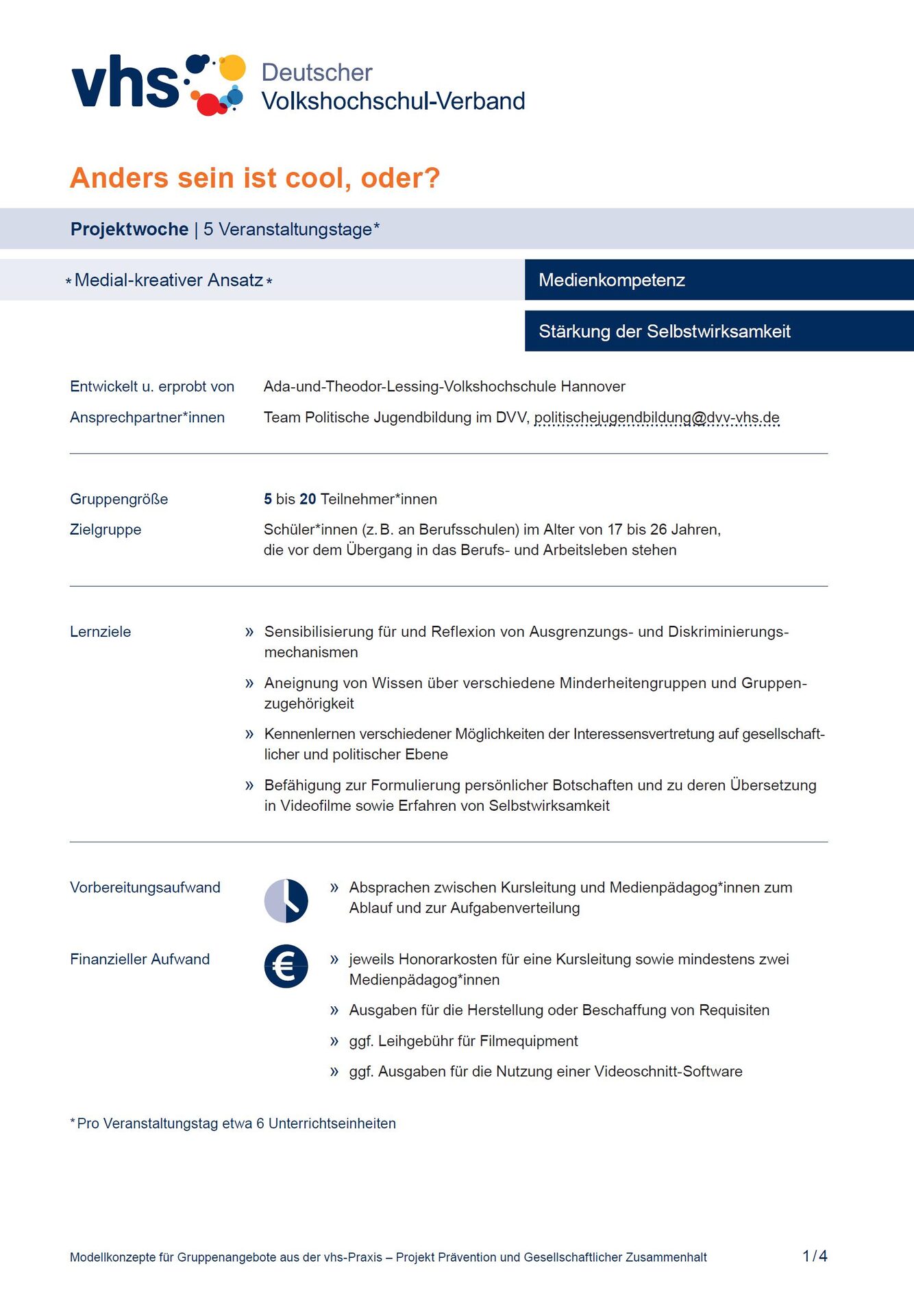 Das Modellkonzept „Anders sein ist cool, oder?” wurde von der Ada-und-Theodor-Lessing-Volkshochschule Hannover entwickelt und erprobt. Falls Sie Fragen zu diesem Modellkonzept haben, können Sie gerne das Team des Projekts Prävention und Gesellschaftlicher Zusammenhalt kontaktieren oder eine E-Mail an E-Mail-Adressepgzdvv-vhsde schreiben.