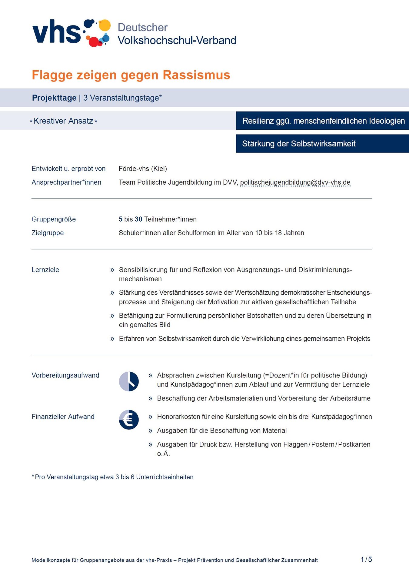 Mit dem Modellkonzept „Flagge zeigen gegen Rassismus“ werden junge Menschen im Alter von 10 bis 18 Jahren für Ausgrenzungs- und Diskriminierungsmechanismen sensibilisiert. Das Konzept kann im Rahmen von Projekttagen stattfinden. Inhaltliche Schwerpunkte sind die Resilienz gegenüber menschenfeindlichen Ideologien und Stärkung der Selbstwirksamkeit.