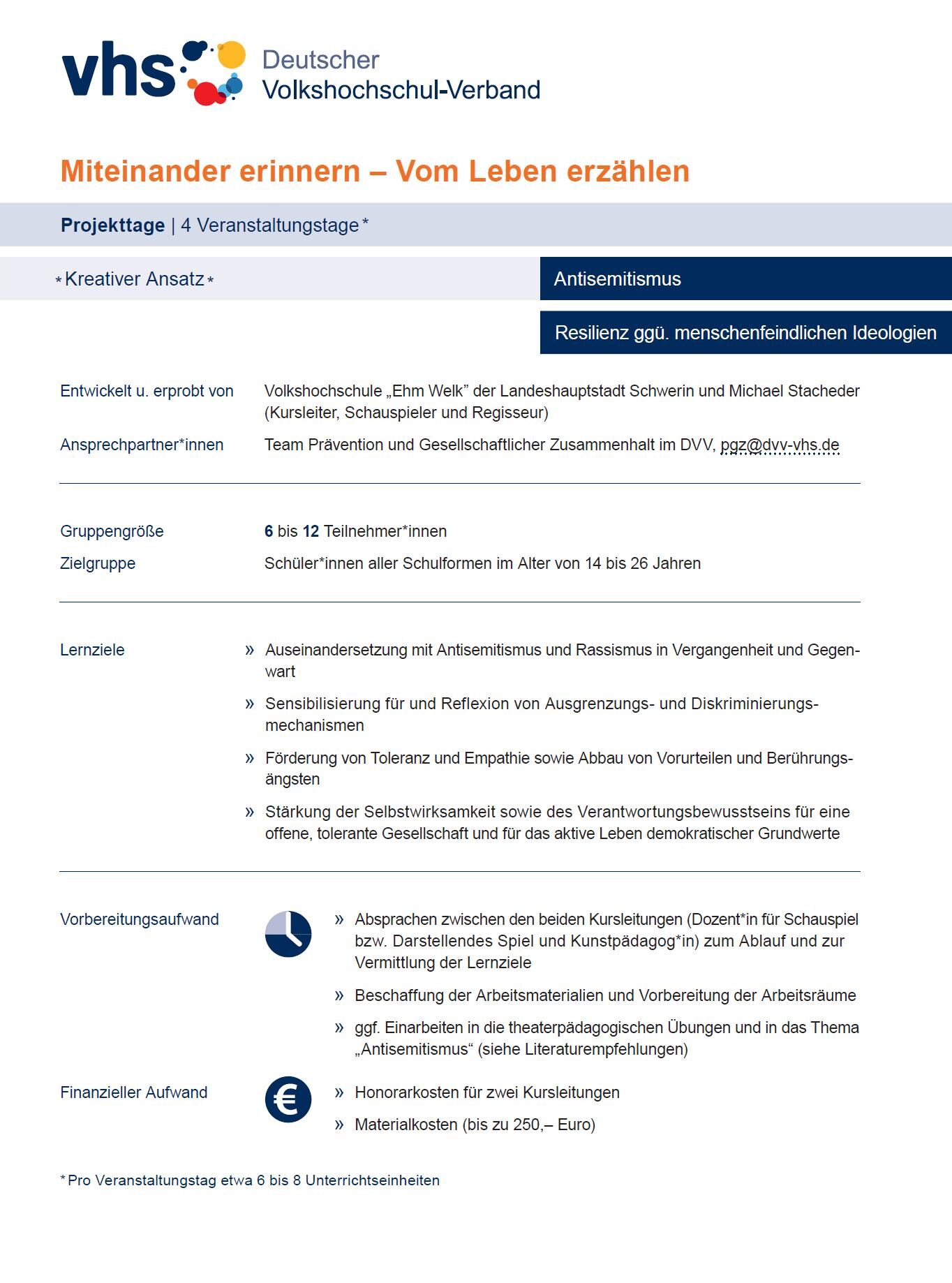 Das Modellkonzept „Miteinander erinnern – Vom Leben erzählen” wurde von der Volkshochschule „Ehm Welk” der Landeshauptstadt Schwerin und Michael Stacheder (Kursleiter, Schauspieler und Regisseur) entwickelt und erprobt. Falls Sie Fragen zu diesem Modellkonzept haben, können Sie gerne das Team des Projekts Prävention und Gesellschaftlicher Zusammenhalt im kontaktieren oder eine E-Mail an E-Mail-Adresse E-Mail-Adressepgzdvv-vhsde schreiben.