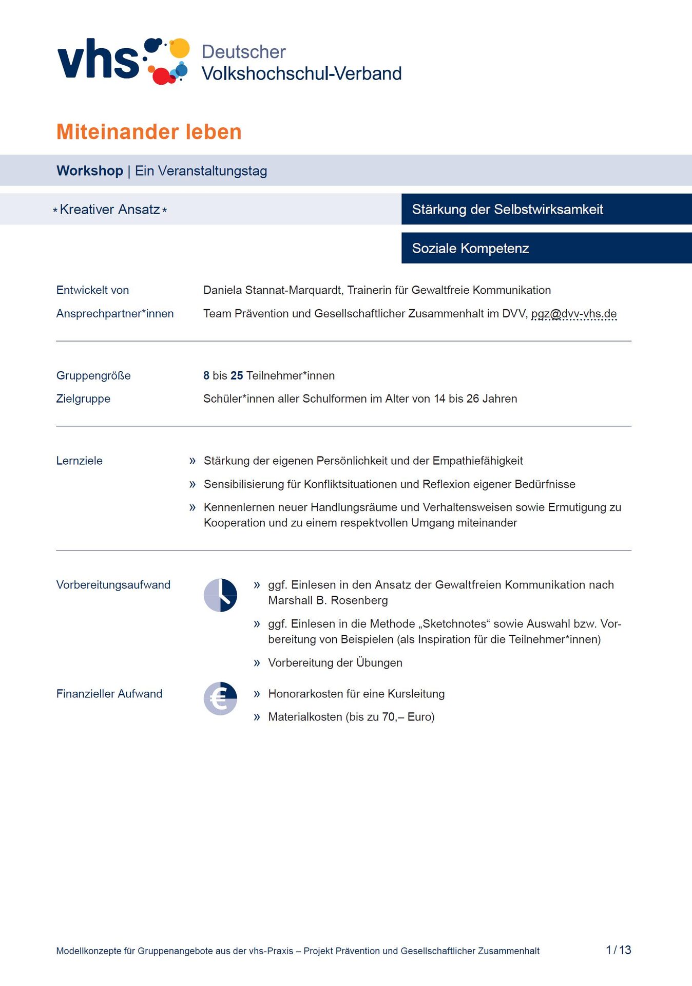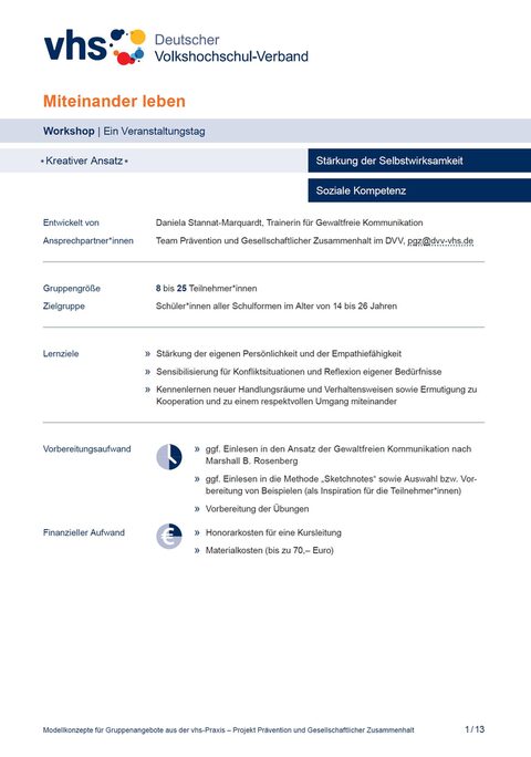 Das Modellkonzept „Miteinander leben” wurde von Daniela Stannat-Marquardt, Trainerin für Gewaltfreie Kommunikation, entwickelt. Falls Sie Fragen zu diesem Modellkonzept haben, können Sie gerne das Team des Projekts Prävention und Gesellschaftlicher Zusammenhalt kontaktieren oder eine E-Mail an E-Mail-Adressepgzdvv-vhsde schreiben.