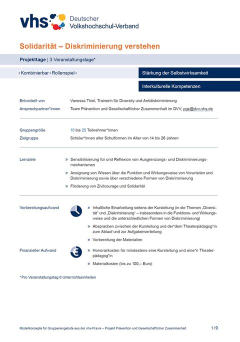 Das Modellkonzept „Solidarität – Diskriminierung verstehen” wurde von Vanessa Thiel, Trainerin für Diversity und Antidiskriminierung, entwickelt. Falls Sie Fragen zu diesem Modellkonzept haben, können Sie gerne das Team des Projekts Prävention und Gesellschaftlicher Zusammenhalt kontaktieren oder eine E-Mail an E-Mail-Adressepgzdvv-vhsde schreiben.