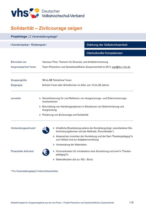 Das Modellkonzept „Solidarität – Zivilcourage zeigen” wurde von Vanessa Thiel, Trainerin für Diversity und Antidiskriminierung, entwickelt. Falls Sie Fragen zu diesem Modellkonzept haben, können Sie gerne das Team des Projekts Prävention und Gesellschaftlicher Zusammenhalt kontaktieren oder eine E-Mail an E-Mail-Adressepgzdvv-vhsde schreiben.