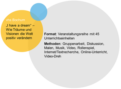 An der vhs Bochum haben sich Teilnehmende des zweiten Bildungswegs mit ihren Träumen und Wünschen beschäftigt. Welche Visionen haben die Welt bisher verändert? Wie lassen sich diese in Taten umsetzen? Mit digitalen Methoden setzten sich die jungen Menschen mit ihren Lebenszielen auseinander und zeigten Handlungsmöglichkeiten auf. Als Abschluss ist ein gemeinsames Video (Öffnet in einem neuen Tab) mit dem Titel "Getrennt und doch Gemeinsam" entstanden.