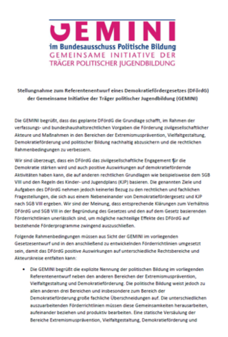 Stellungnahme der GEMINI zum Referentenentwurf eines Demokratiefördergesetzes (DFördG)