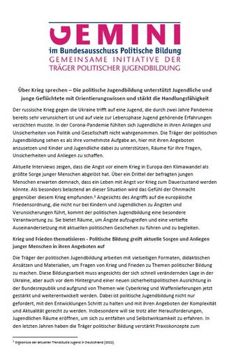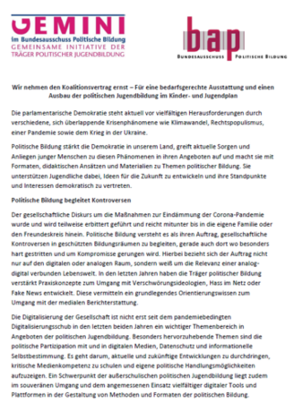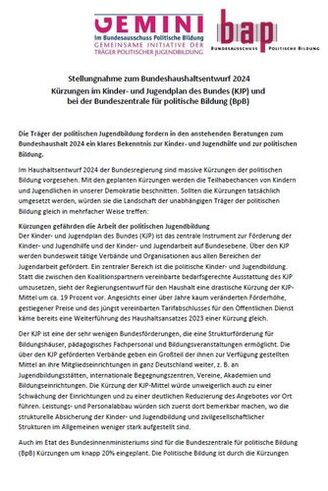 Die GEMINI („Gemeinsame Initiative der Träger Politischer Jugendbildung im bap“) plädiert in einer Stellungnahme für eine bedarfsgerechte Ausstattung und einen Ausbau der politischen Jugendbildung im Kinder- und Jugendplan.
