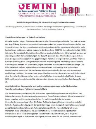 Die Träger der politischen Jugendbildung positionieren sich in dieser Stellungnahme der GEMINI („Gemeinsame Initiative der Träger Politischer Jugendbildung im bap“) zu den Herausforderungen, die im Zuge der sozial-ökologischen Transformationen entstehen.