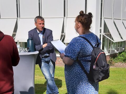Auf diese 90-minütige Vorbereitungsphase folgte nach einer Pause das eigentliche Speeddating, bei dem die Bundestagskandidierenden von CDU, SPD, FDP und der Linken sowie die Kreisvorsitzende von Bündnis90/Die Grünen als Gesprächspartner*innen zur Verfügung standen. Für sie wurden auf einer Wiese Stehtische bereitgestellt. Die Jugendlichen fanden sich in neuen Gruppen von 3 bis 4 Personen zusammen und stellten jeweils einem oder einer Politiker*in ihre Fragen. Nach 15 Minuten erfolgte jeweils ein Wechsel, sodass alle Teilnehmenden die Möglichkeit hatten, mit allen Politiker*innen zu sprechen. Die vorbereiteten Fragen dienten dabei als roter Faden und die jungen Menschen machten sich Notizen zu den Antworten.