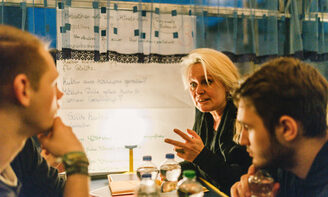 „Nationalismus in Europa” steht auf einem der handgeschriebenen Plakate. „Umwelt” auf einem zweiten. „Regionale Zukunft” und „Wahlen” sind die weiteren Themen, auf die sich die Experten jetzt verteilen. Jeweils eine Viertelstunde soll miteinander gesprochen werden, dann steht ein fliegender Wechsel an. „So hoffen wir auf eine größtmögliche Zahl von Begegnungen”, begründet Magda Langholz die an ein Speeddating erinnernde Versuchsanordnung. Und tatsächlich. Es klappt.