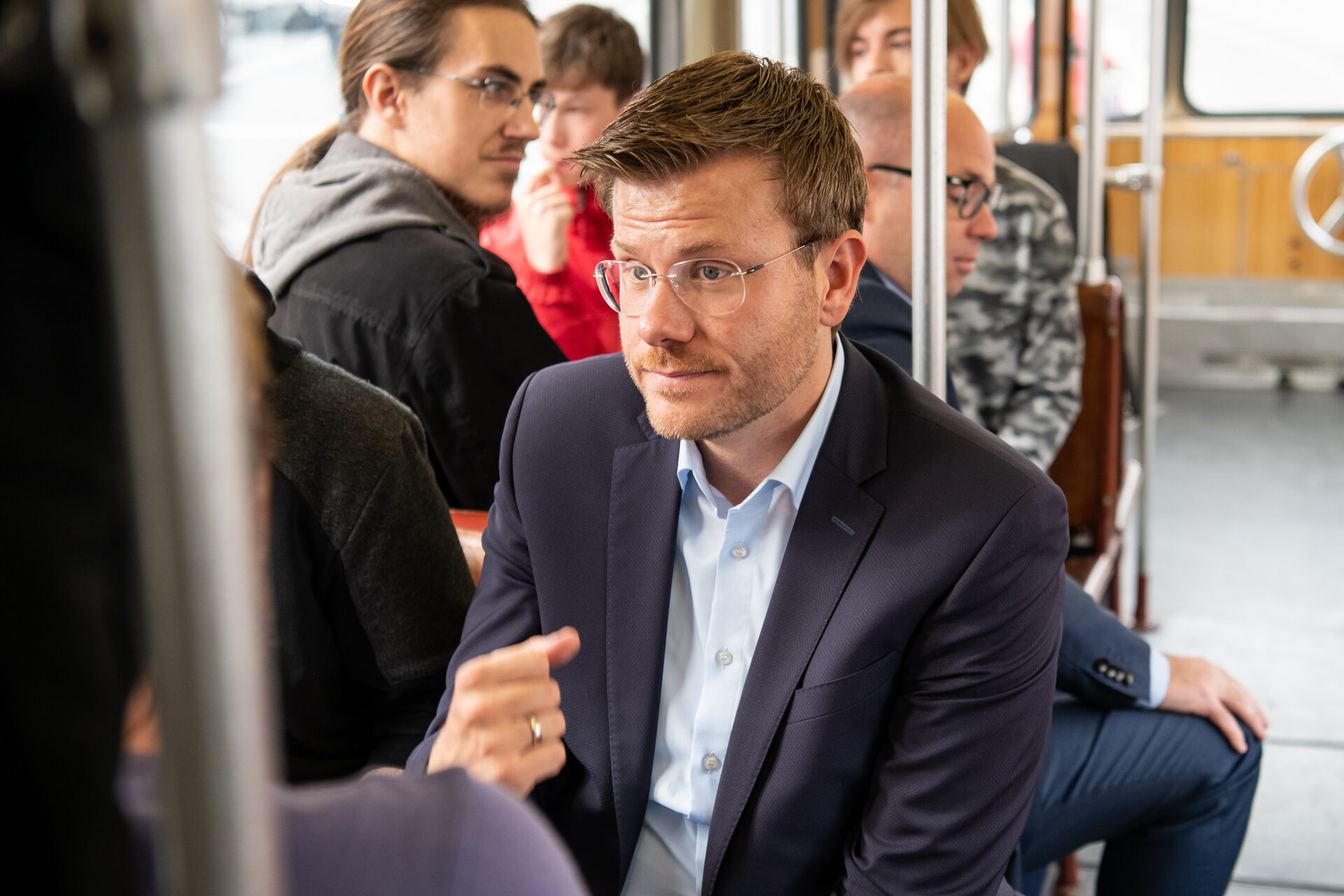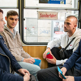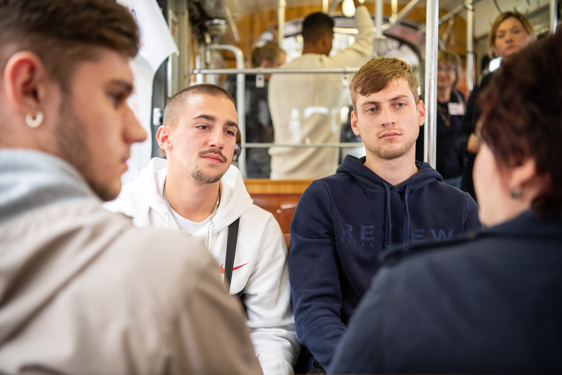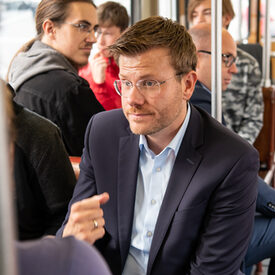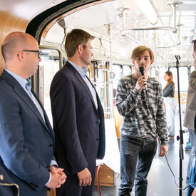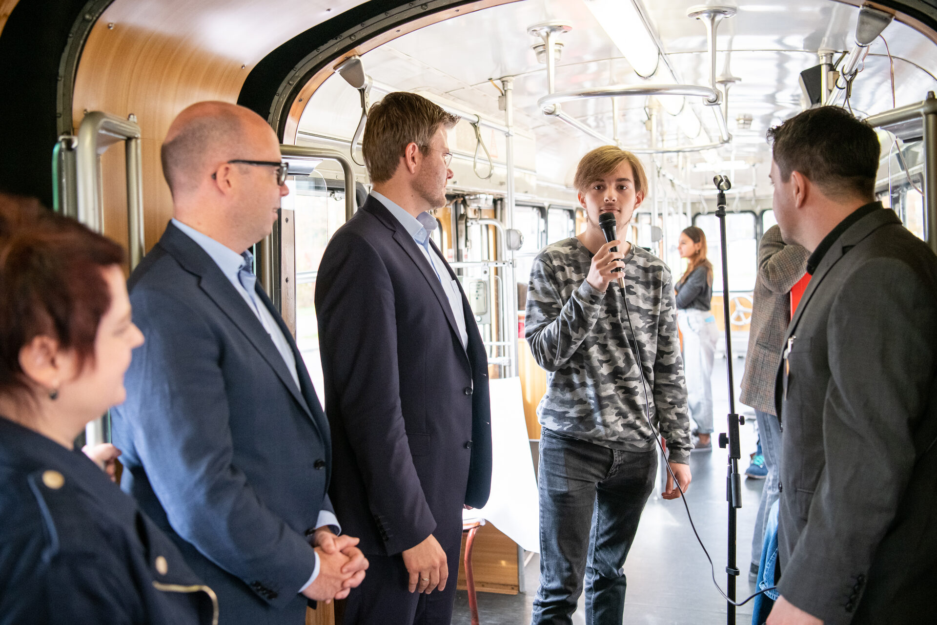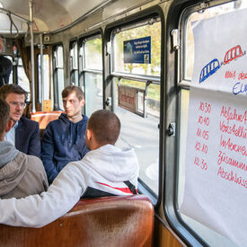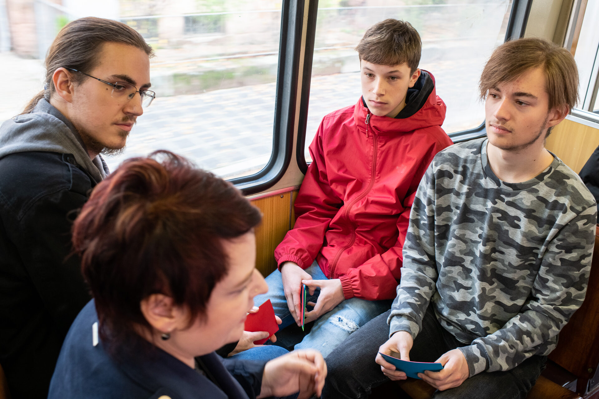 Während der rund zweistündigen Fahrt mit der historischen Tram stellten sich Verena Osgyan (Die Grünen), Thorsten Brehm (SPD) und Marcus König (CSU) den Fragen der Jugendlichen. Organisiert wurde die Diskussionsveranstaltung vom Bildungszentrum im Bildungscampus der Stadt Nürnberg.