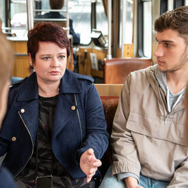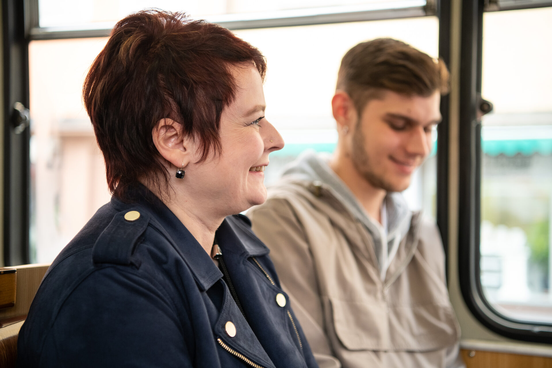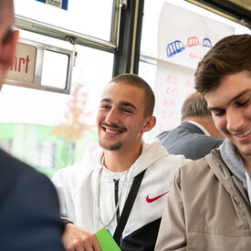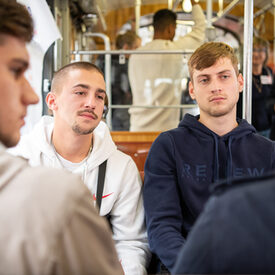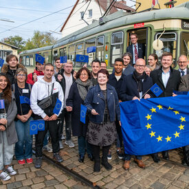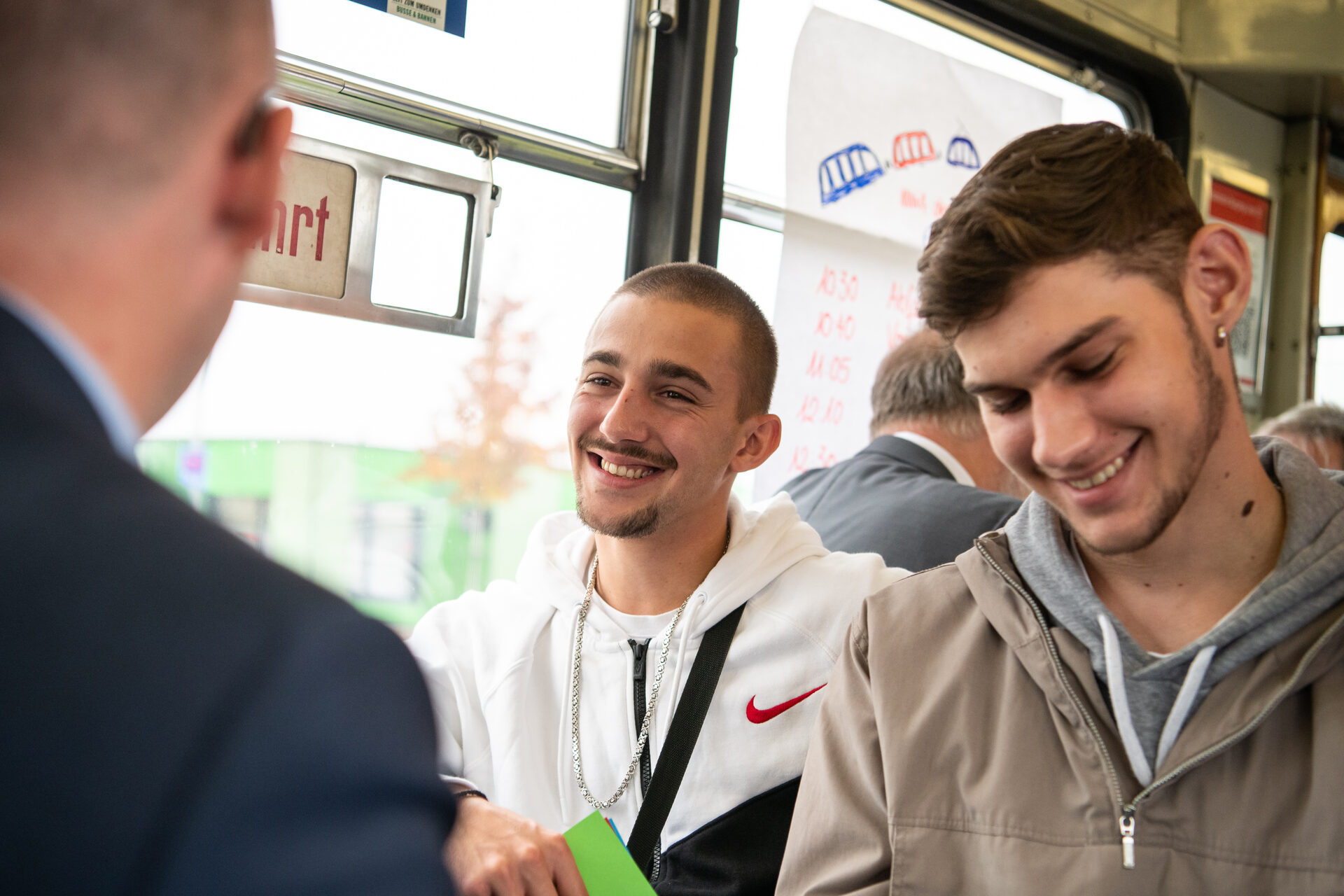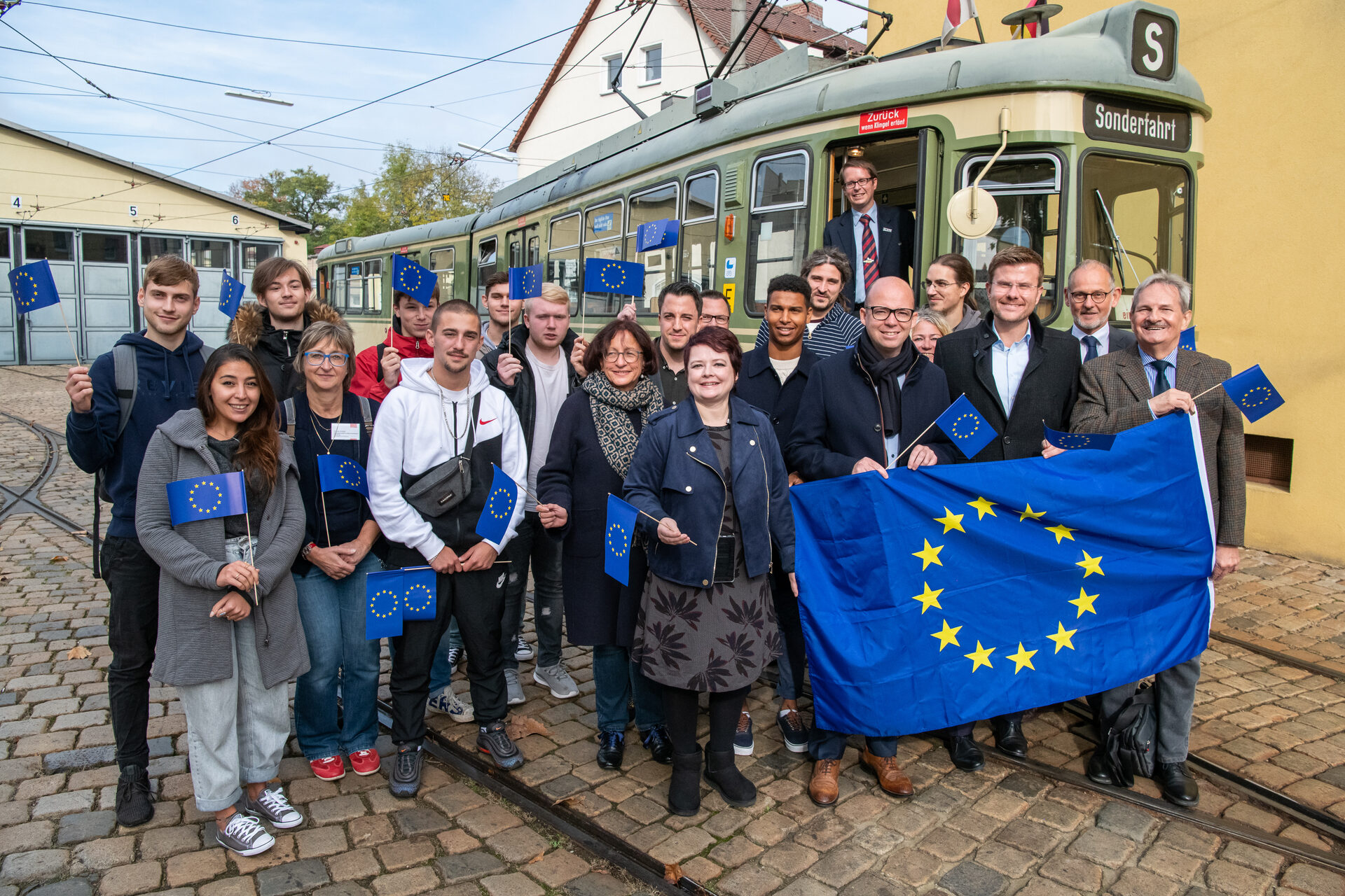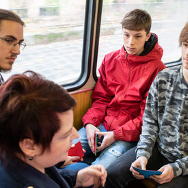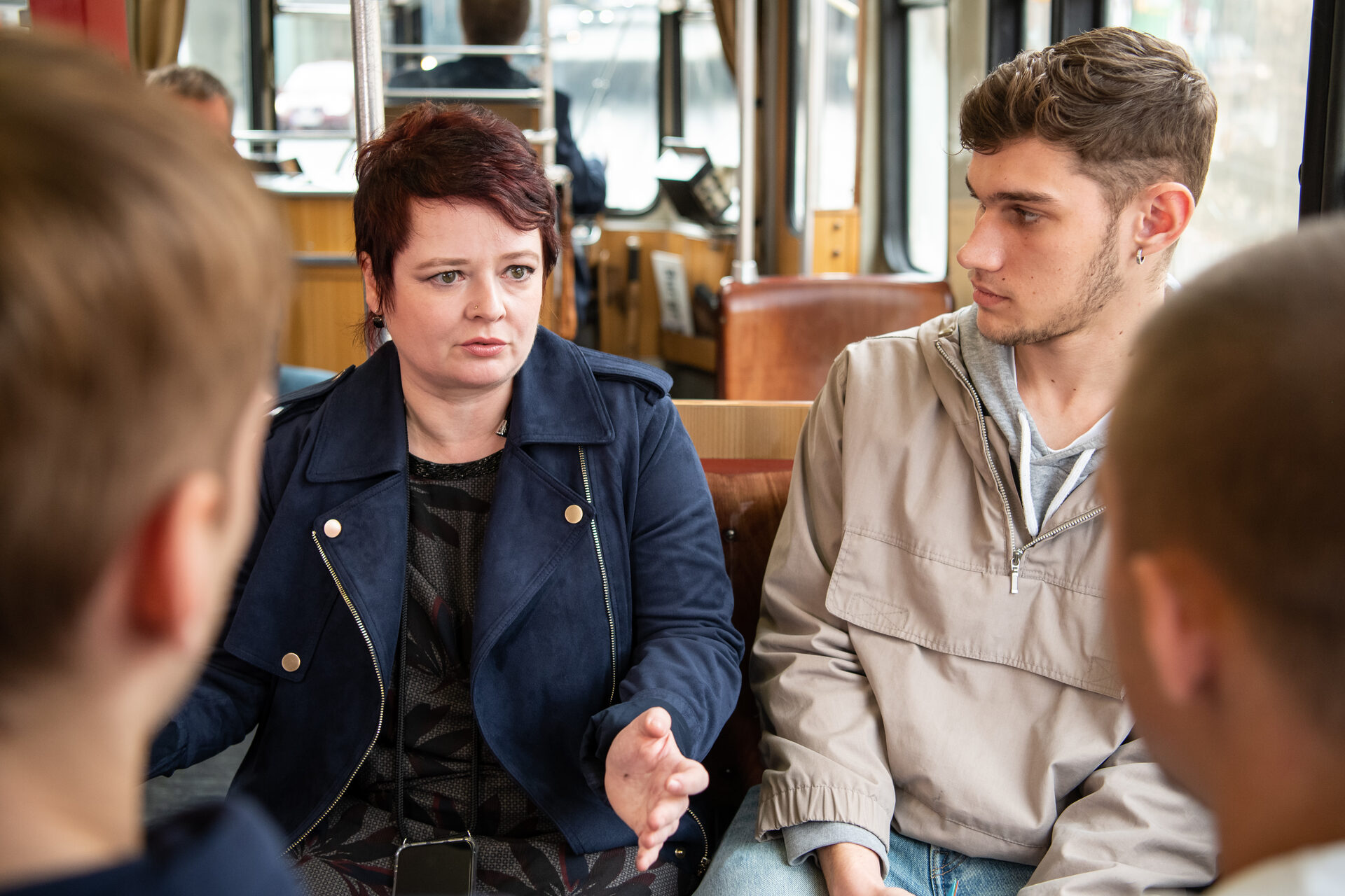 Während der rund zweistündigen Fahrt mit der historischen Tram stellten sich Verena Osgyan (Die Grünen), Thorsten Brehm (SPD) und Marcus König (CSU) den Fragen der Jugendlichen. Organisiert wurde die Diskussionsveranstaltung vom Bildungszentrum im Bildungscampus der Stadt Nürnberg.