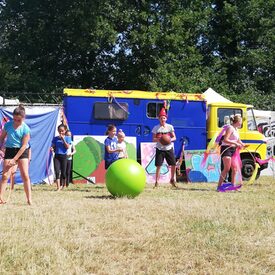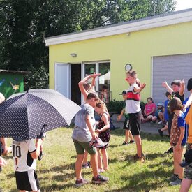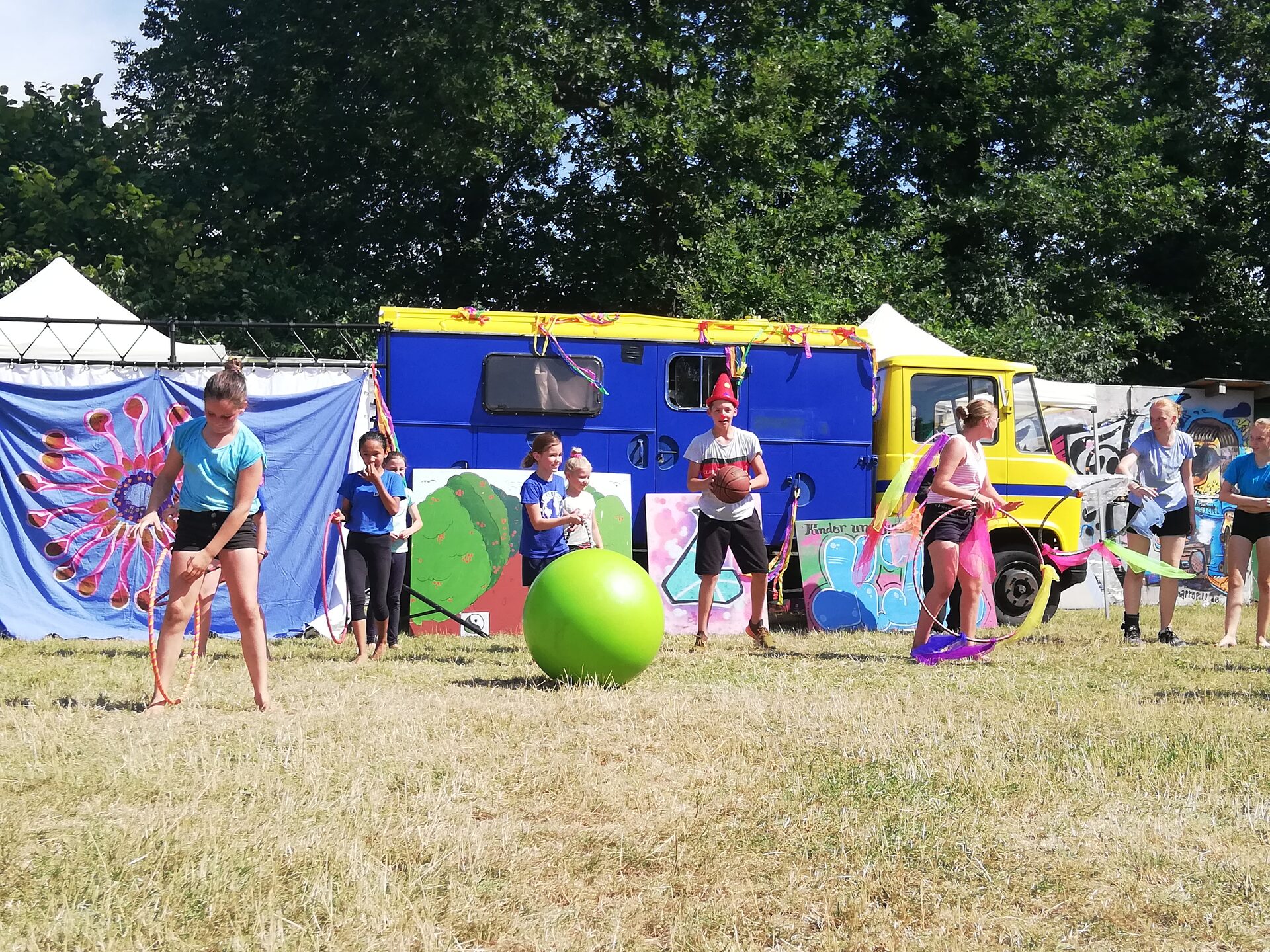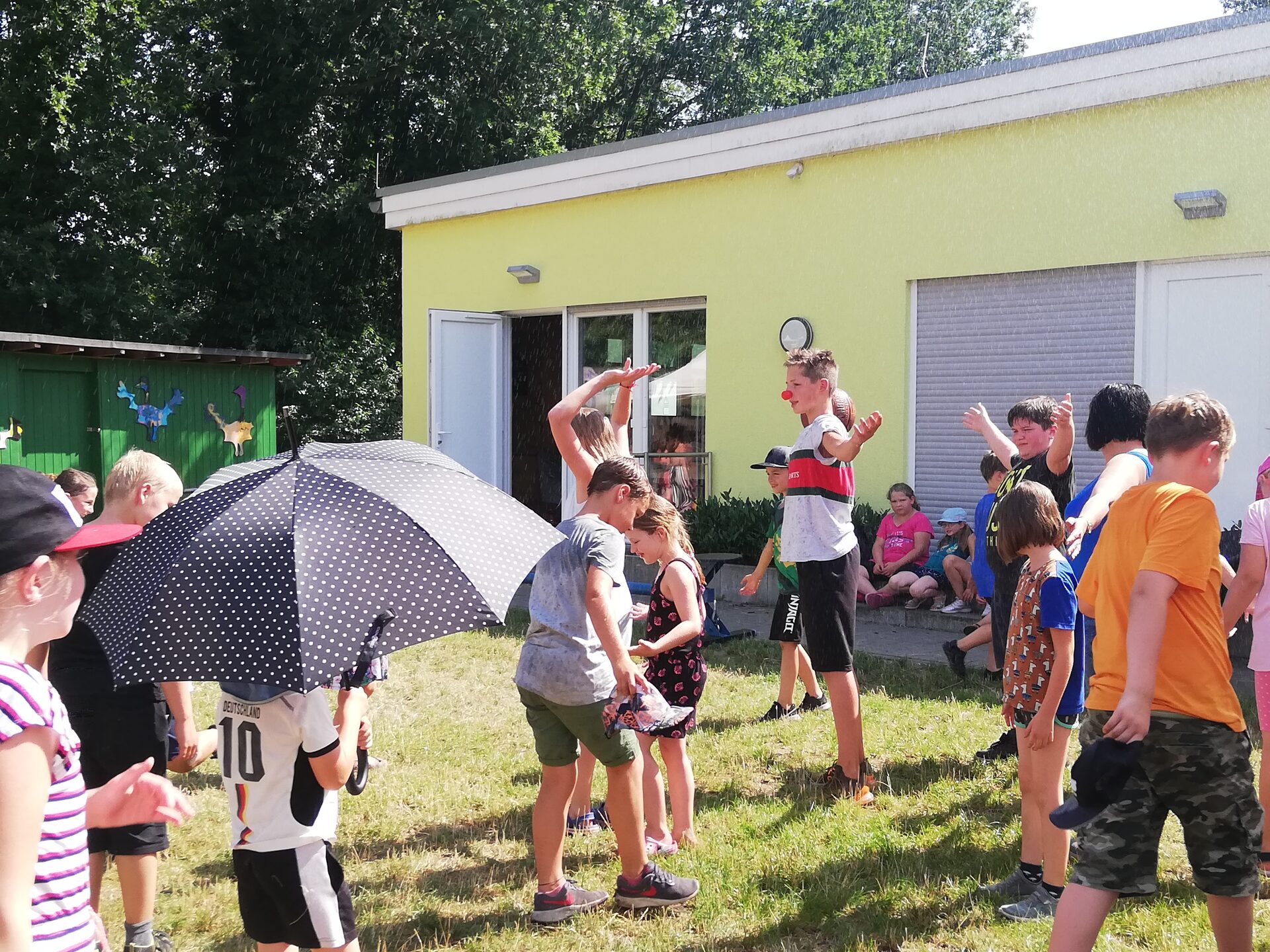 Bei der Zirkusvorstellung im Jugendcafé des Kinder- und Jugendwerks heißt es dann: „Vorhang auf und Manege frei!“ Mit viel Witz und hoher Konzentration ließen sich die jungen Künstler*innen nicht von den hohen Temperaturen an diesem Sommernachmittag irritieren und präsentierten ein breites Programm. Es gab Akrobat*innen, Clowns und Skechtemeister*innen, Einradkünstler*innen, Hula-Hopp-Artist*innen und eine Solo-Gesang-Performance zu bestaunen. Zur Abkühlung und als besonderes Highlight rückte ein Feuerwehrfahrzeug zu einem besonderen Einsatz an – ein Tanz im Regen mit Eltern, Geschwistern und weiteren Gästen.