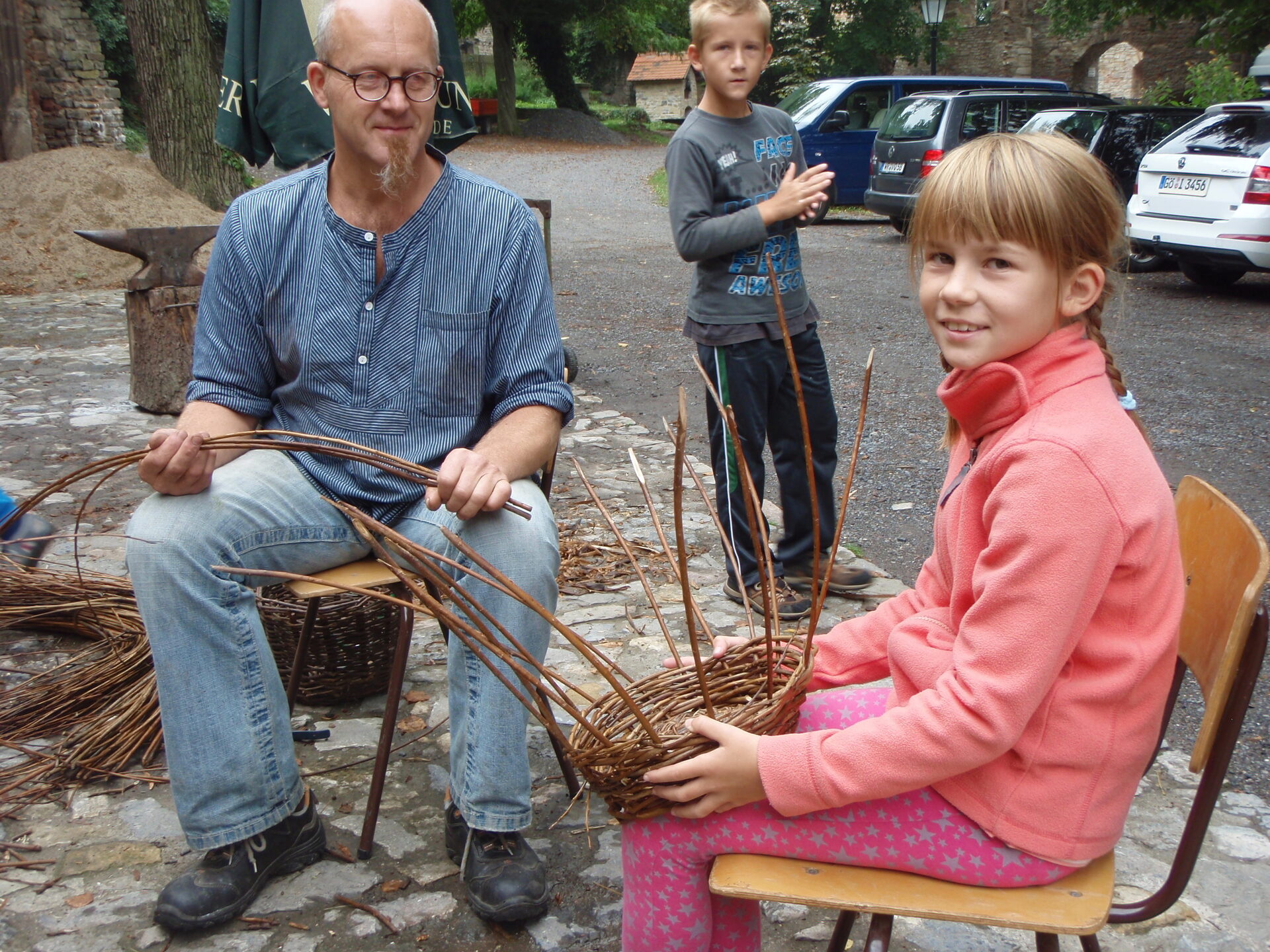 Eine andere Gruppe beschäftigt sich derweil mit altem Handwerk. Als Dozenten hat Torsten Werle das Ehepaar Büchel gewonnen, das im nahe gelegenen Neudorf den historischen Kunsthandwerkerhof Alte Pfarre betreibt. Die zehnjährige Charlotte hat eigenhändig einen Brotkorb geflochten. Den will sie ihrer Oma schenken. Ihr Zwillingsbruder Alexander hat ein Messer geschmiedet und ein Herz aus Speckstein geformt. „Schon die alten Wikinger haben aus Speckstein Schalen hergestellt“, erzählt Jörg Büchel. Er erklärt den Kindern die historischen Werkzeuge, für deren Handhabung man Geschicklichkeit und ein wenig Übung braucht. Seine Frau Kirsten zeigt den Kindern derweil, wie Filzen funktioniert.