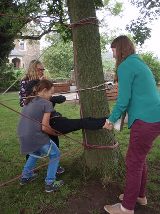 Die Medienkompetenz der Teilnehmerinnen und Teilnehmer zu fördern, ist Torsten Werle ein ebenso großes Anliegen wie das Training sozialer Kompetenzen. Volker Schmidt, leitender Bildungsreferent in der Christlichen Jugendbildungs- und Begegnungsstätte Schloss Mansfeld, hat dazu einiges in petto: Zwischen zwei Bäumen spannt er ein Netz aus Seilen. Nun muss jede Teilnehmerin das Netz durch eine andere Lücke durchqueren ohne dabei das Seil zu berühren – eine Aufgabe, die nur im Team gelingen kann.