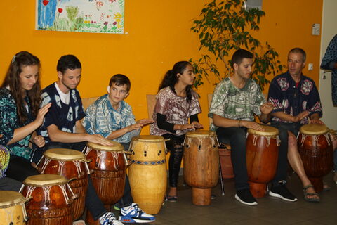 Mit der Künstlerin Ija Daubenspeck haben einige Kinder und Jugendliche große und kleine Leuchtobjekte angefertigt. Beim Abschlussfest fallen ein großer Drache und ein Schmetterling ins Auge, das Herz ist ein wiederkehrendes Motiv. Einige Teilnehmer haben im Trommel-Workshop von Matthias Koch die musikalische Eröffnung der Feier einstudiert.