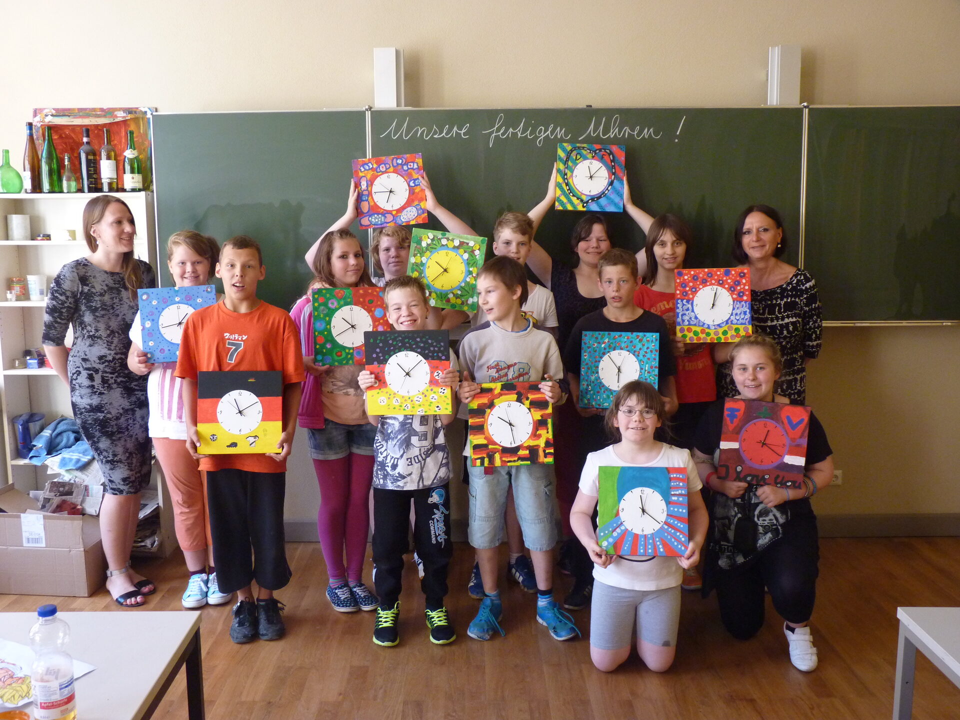 Vormittags ging es dann gleich handwerklich zur Sache und die Kinder konnten im Lauf der Woche ihre eigene Wanduhr gestalten. Zuerst kam die Entwicklung der Idee für ihre persönliche Wanduhr, dann das Anfertigen der Skizzen. Das ging bei den Kindern mit ihrer reichen Phantasie sehr schnell und so legten sie umgehend mit der Grundierung des Holzkastens, der Bemalung und Gestaltung des Uhrenkörpers, der Bemalung und Beschriftung des Ziffernblattes und dem Bohren von Löchern zum Einsetzen des Uhrwerkes los. Am Ende der Woche wurden die individuellen Wanduhren zusammengesetzt.